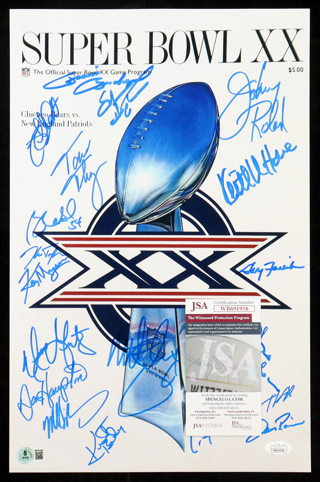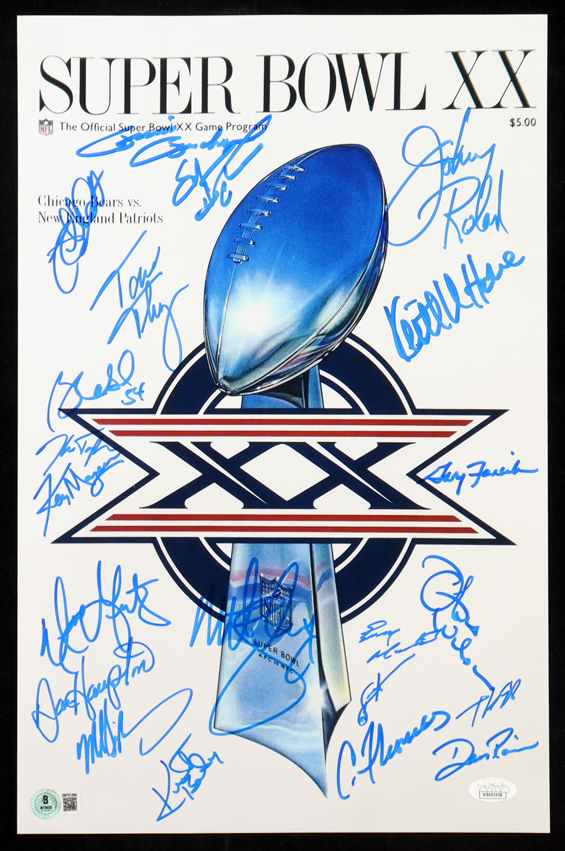 1985 Bears Super Bowl XX 11x17 Photo Team-Signed By (21) with Dan Hampton, Mike Singletary, Tom Thayer, Matt Suhey (Beckett & JSA)