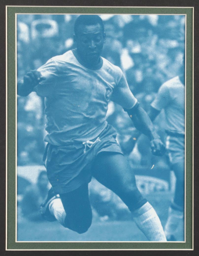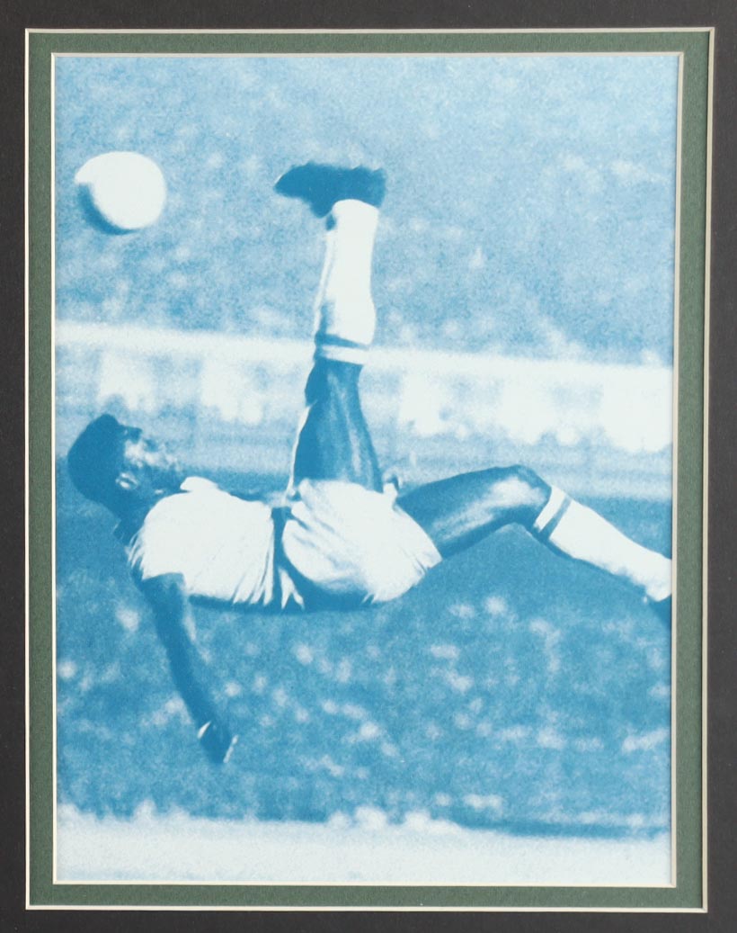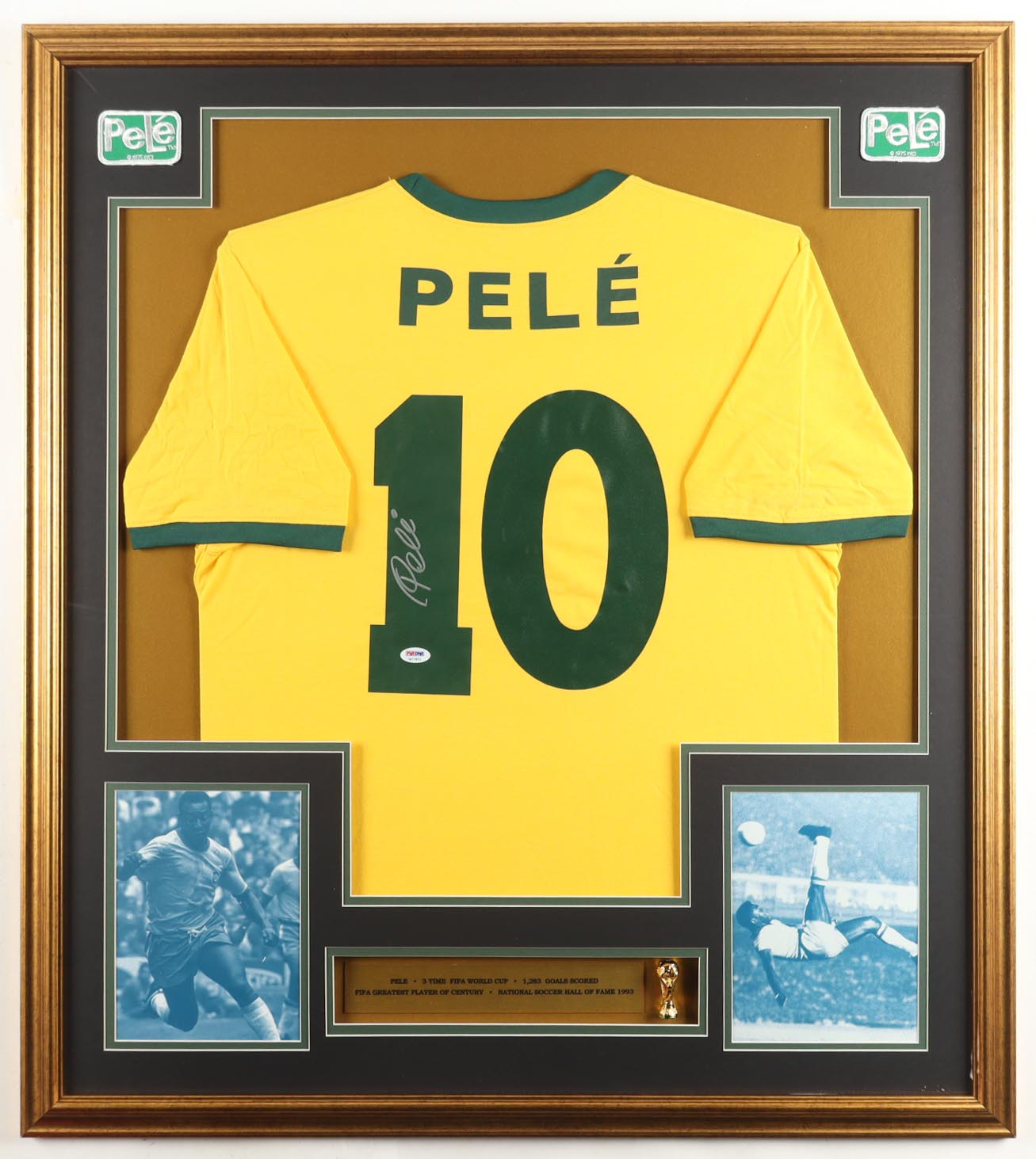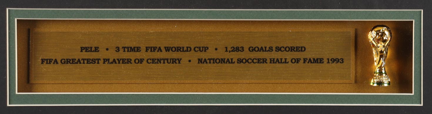 Custom frame measures 35" x 43" in size and features a jersey hand-signed by Pele (D. 2022, HOF). Please note that the 8" x 10" photos may be in reverse order. Display also features a World Cup Trophy Pin.