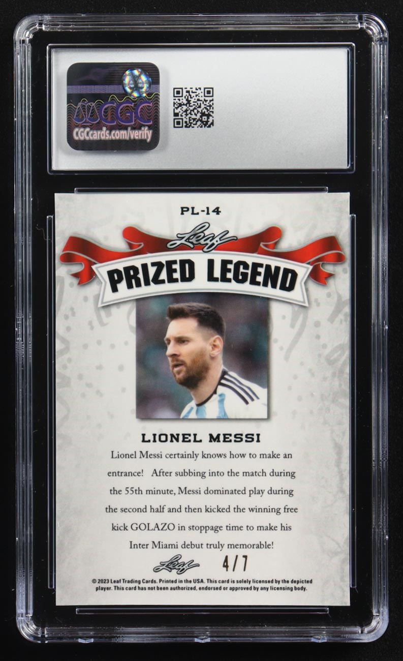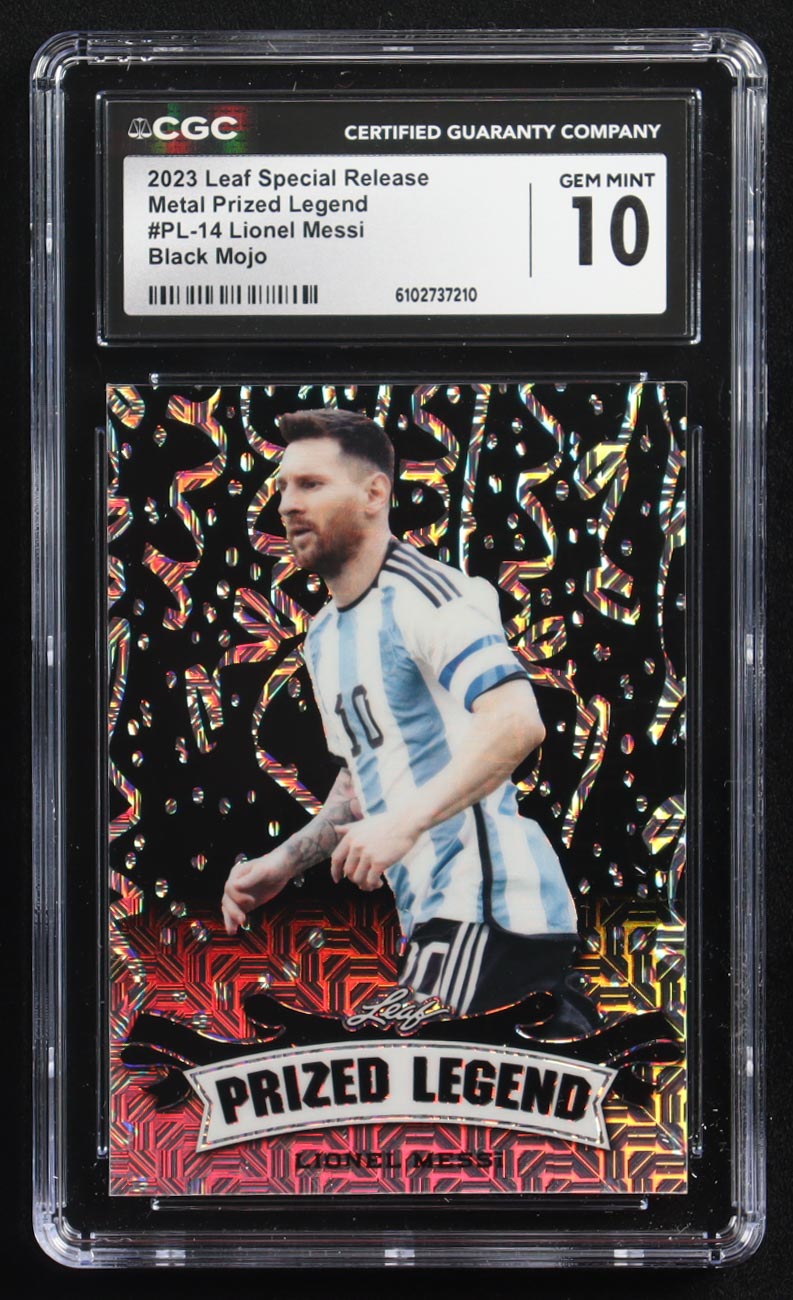 Lionel Messi 2023 Leaf Special Release Metal Prized Legend Black Mojo #PL-14 #4/7 (CGC 10)