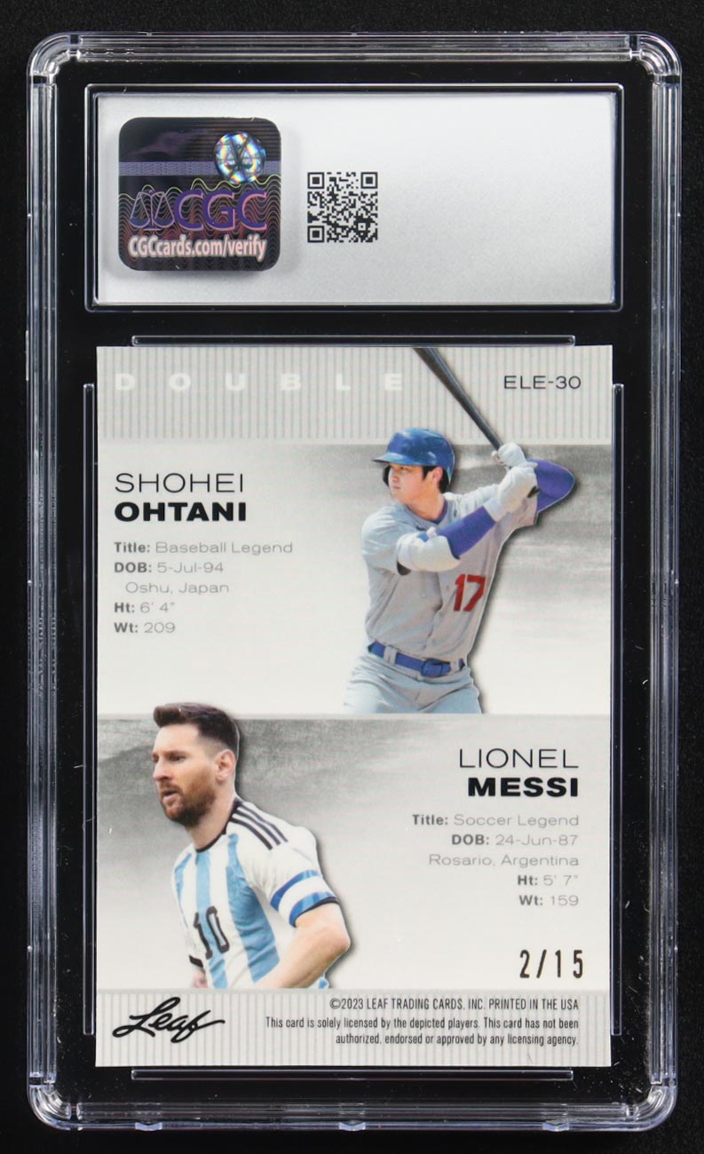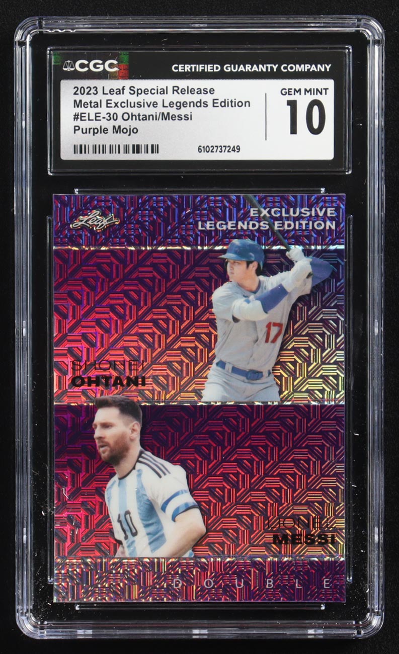Lionel Messi / Shohei Ohtani 2023 Leaf Special Release Metal Exclusive Legends Edition Purple Mojo Double #ELE-30 #2/15 (CGC 10)