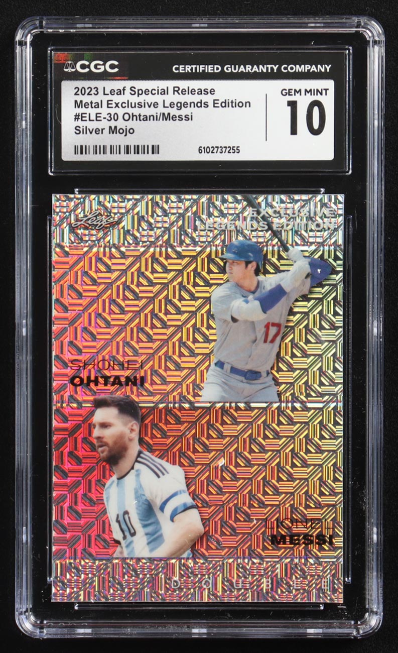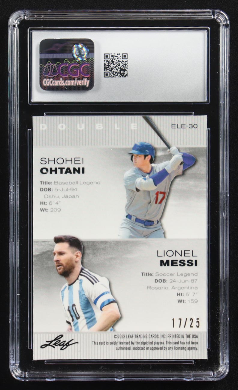 Lionel Messi / Shohei Ohtani 2023 Leaf Special Release Metal Exclusive Legends Edition Silver Mojo Double #ELE-30 #17/25 (CGC 10)