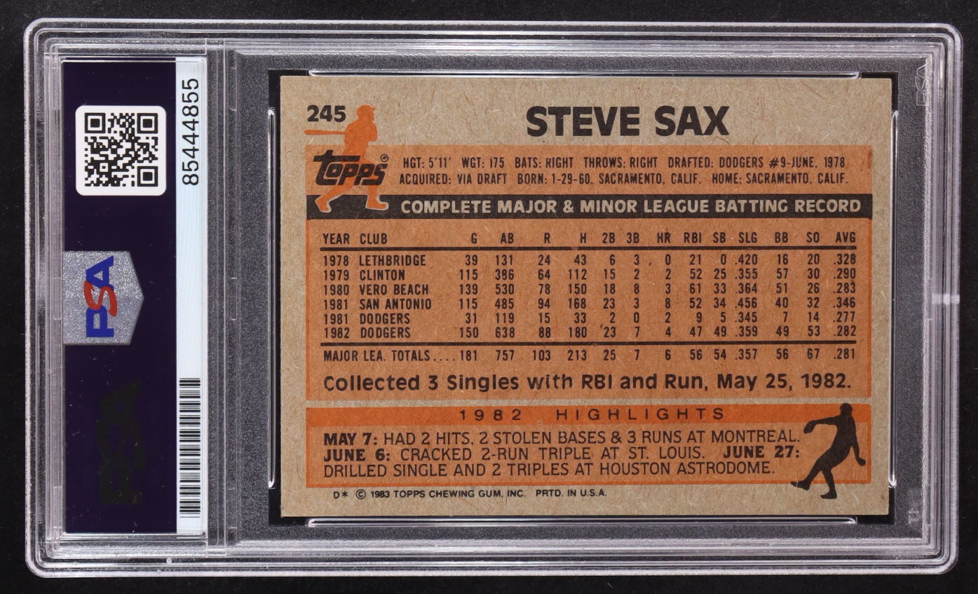 Steve Sax Signed 1983 Topps #245 Inscribed "82 NL ROY" (PSA | Auto Grade PSA Authentic)