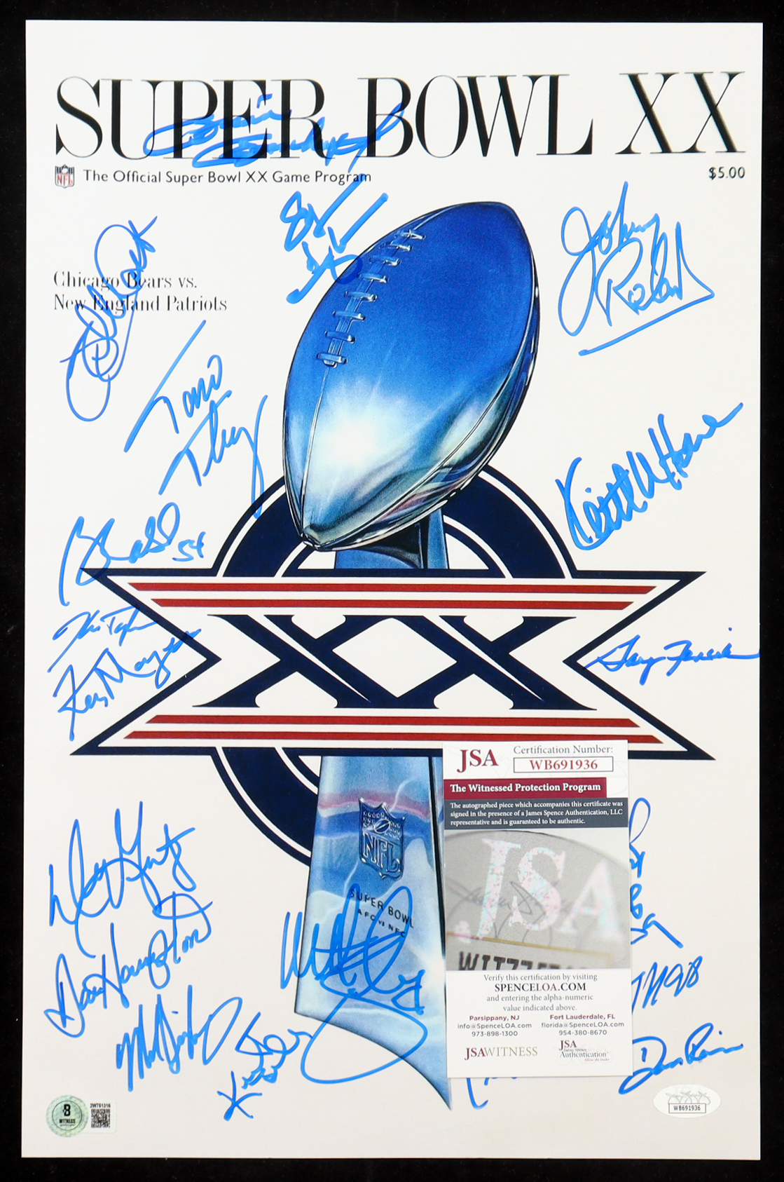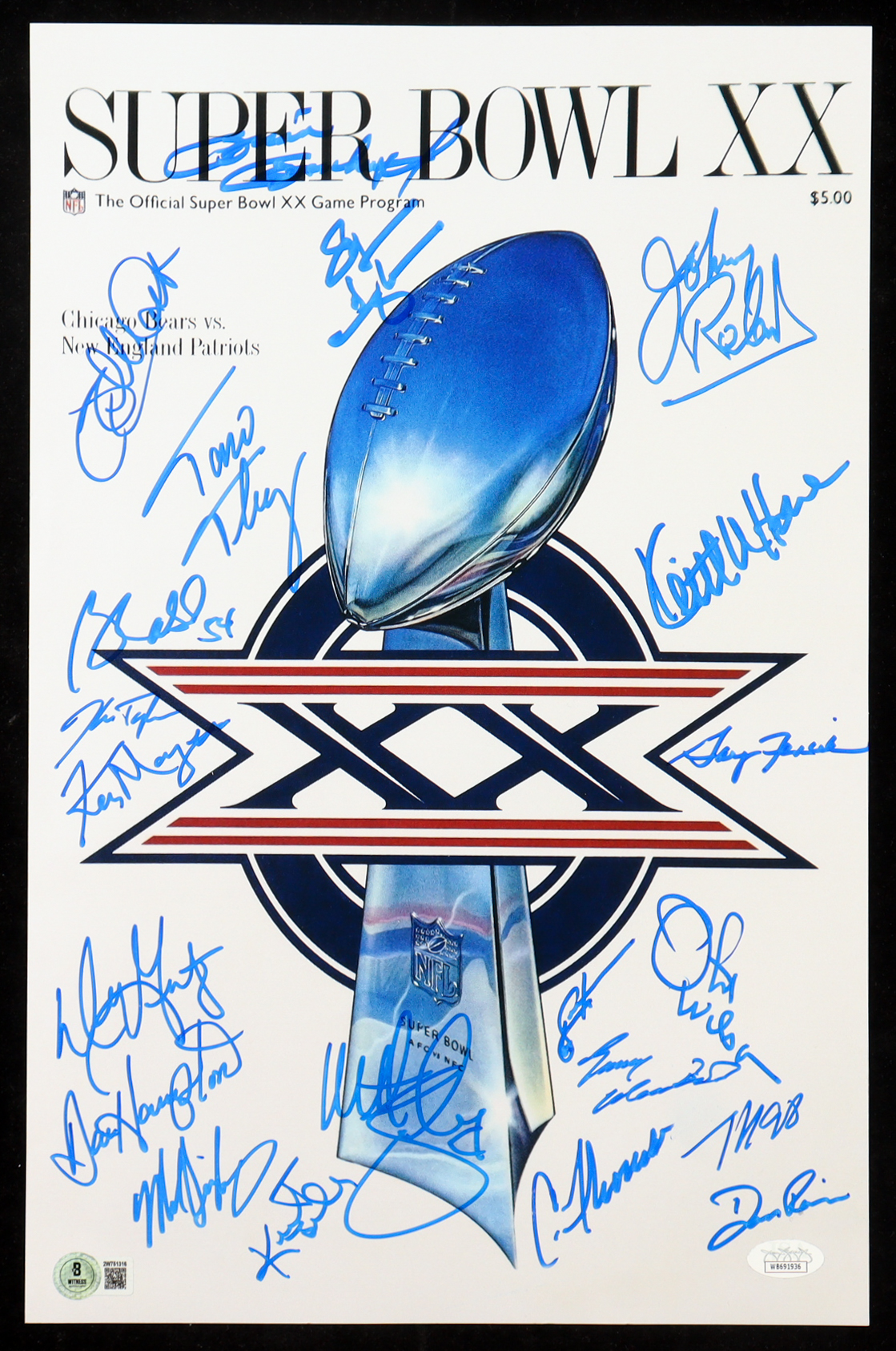 1985 Bears Super Bowl XX 11x17 Photo Team-Signed By (21) with Dan Hampton, Mike Singletary, Tom Thayer, Matt Suhey (Beckett & JSA)