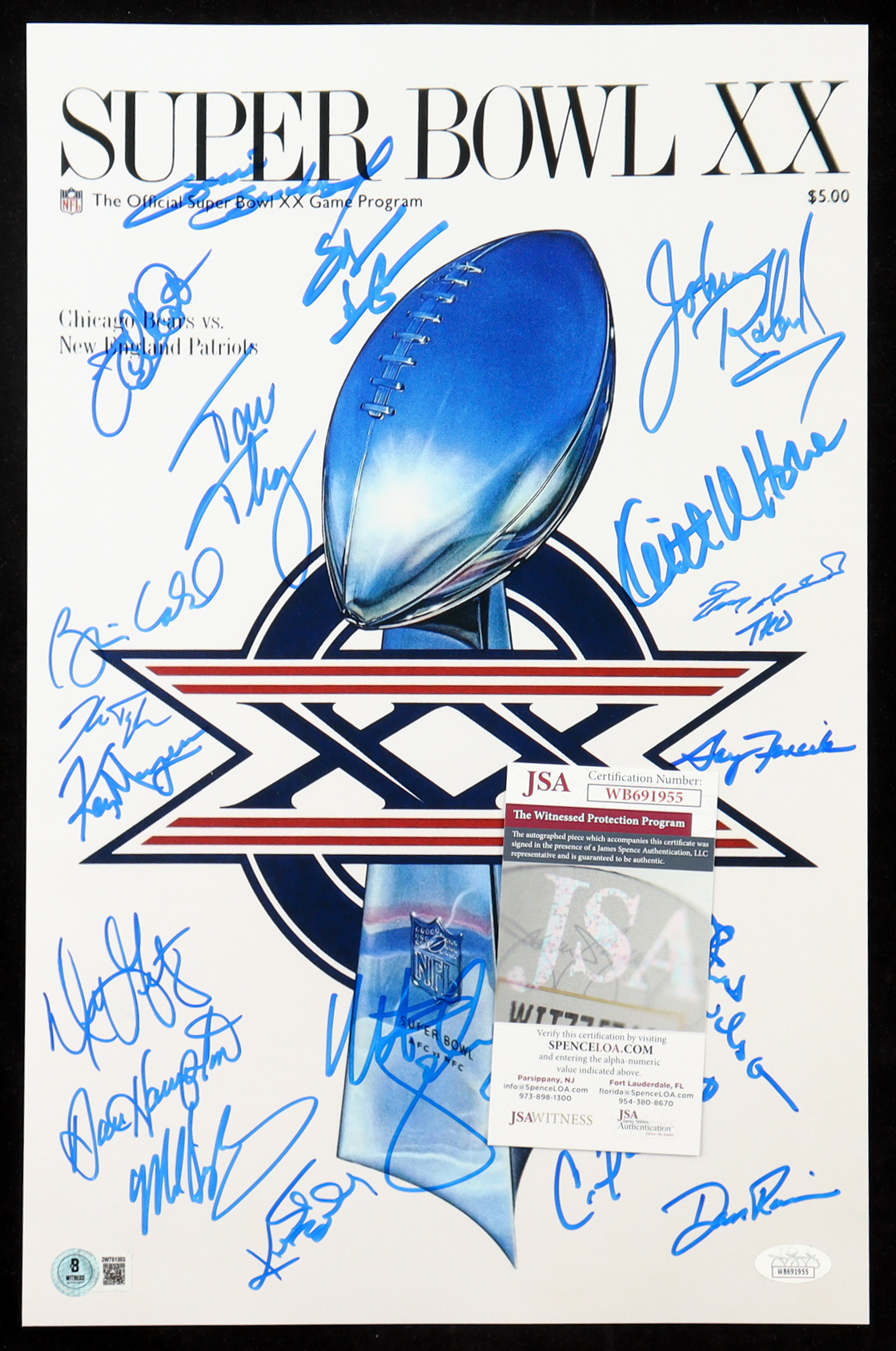 1985 Bears Super Bowl XX 11x17 Photo Team-Signed By (21) with Dan Hampton, Mike Singletary, Tom Thayer, Matt Suhey (Beckett & JSA)