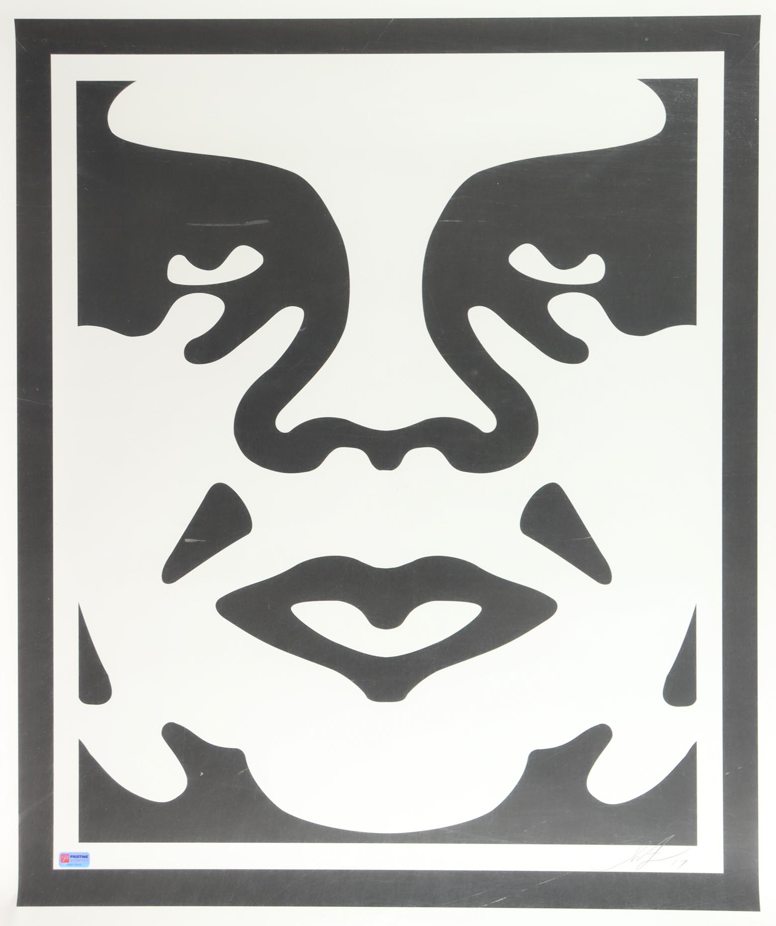 This piece measures approximately 25" x 30" in size and is hand-signed by renowned street artist, Shepard Fairey.