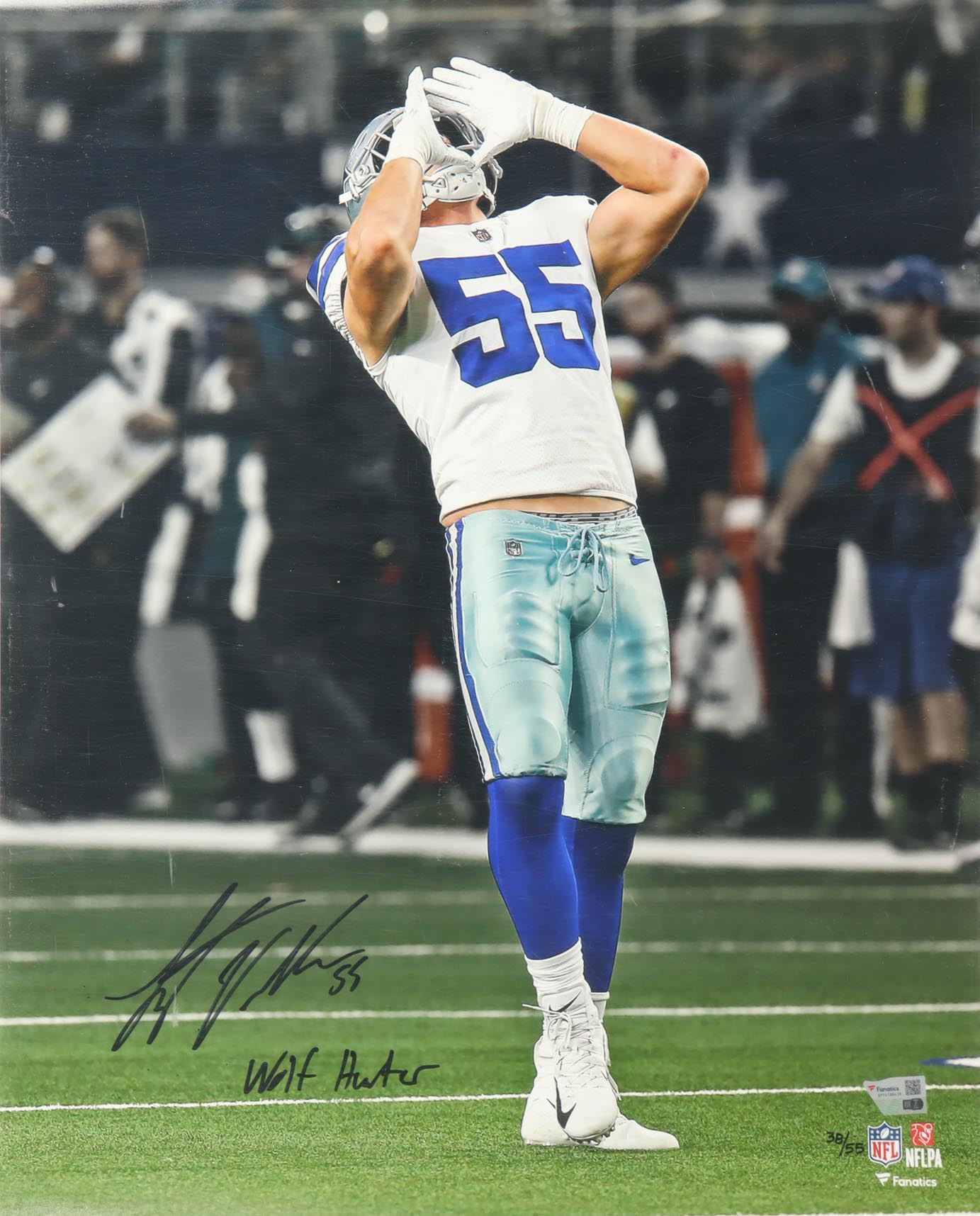 Photo measures 16” x 20” in size and has been hand-signed and inscribed by Leighton Vander Esch (Dallas Cowboys). This item is limited edition and has been numbered #38/55.