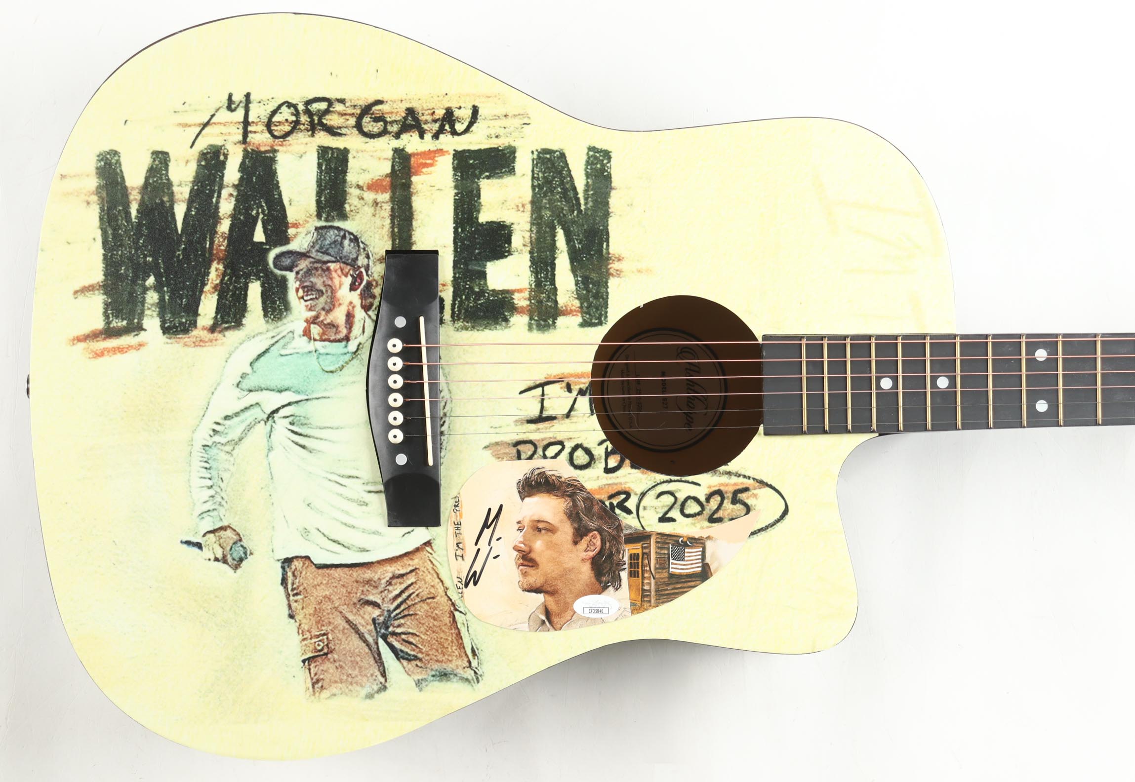 Acoustic guitar measures approximately 38" in length and has been hand-signed by Morgan Wallen on a CD insert that has been repurposed as the pickguard.