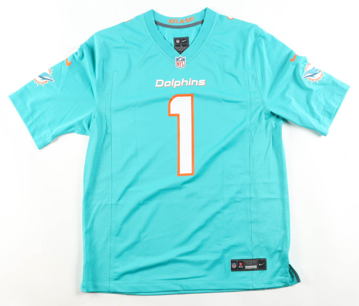 Nike jersey with everything pressed on, size L. Hand-signed by Tua Tagovailoa (Miami Dolphins).