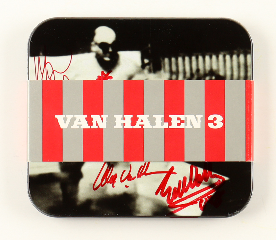 Limited Edition "Van Halen 3" CD box set has been hand-signed on the lid of the tin by Eddie Van Halen (D. 2020), Michael Anthony, Cary Cherone, and Alex Van Halen. The CD is included as shown. Please note, the edges of the tin are lightly scuffed.