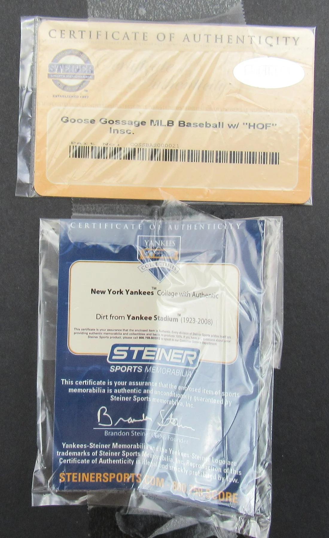 Custom shadowbox measures 19” x 22” in size and features a baseball that has been hand-signed and inscribed by Goose Gossage (New York Yankees, HOF). The display also features dirt from Yankees Stadium.