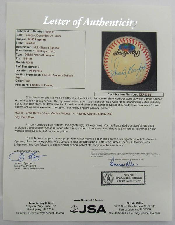 Rawlings Official National League baseball has been hand-signed by (7) MLB legends including Pete Rose, Ernie Banks, Jocko Conlan, Monte Irvin, Sandy Koufax, and Stan Musial.