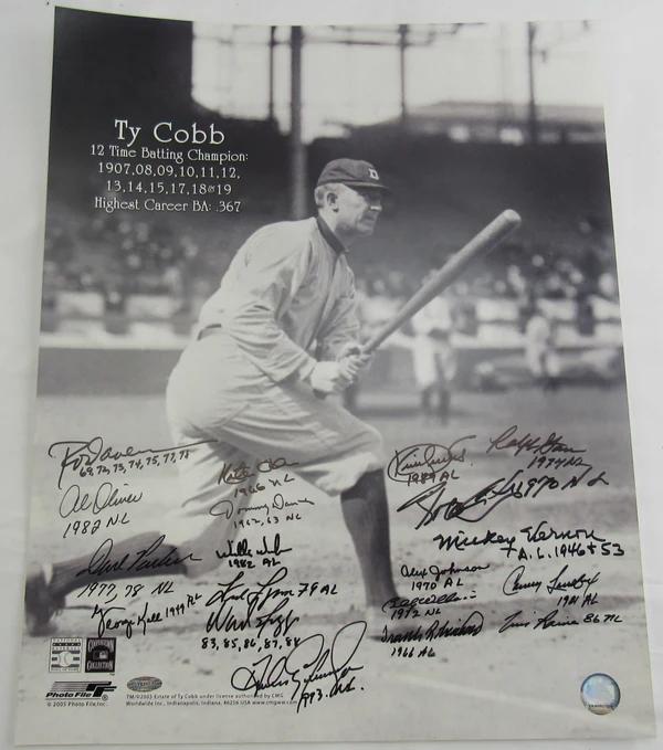 Photo measures 16” x 20” in size and has been hand-signed and inscribed by (16) baseball batting leaders including Kirby Puckett, Frank Robinson, Rod Carew, Tim Raines, Wade Boggs, Billy Williams, and (10) others.
