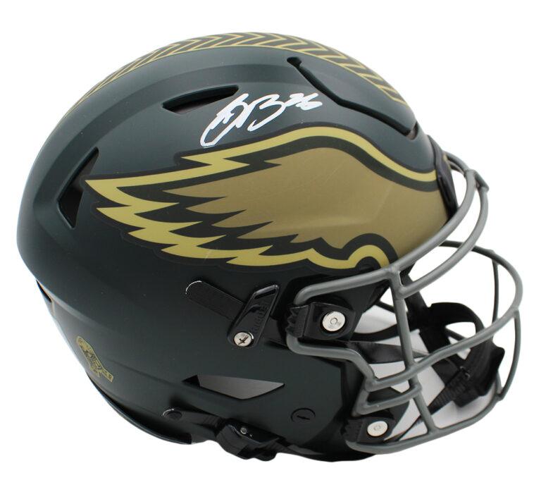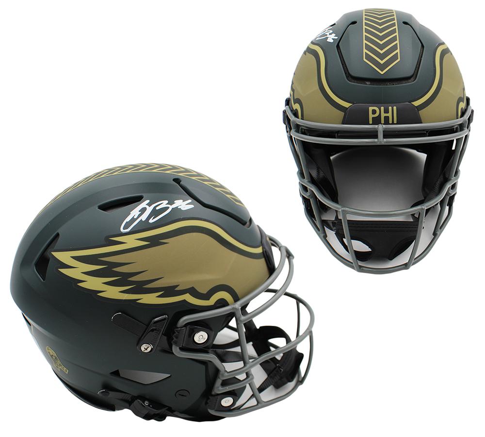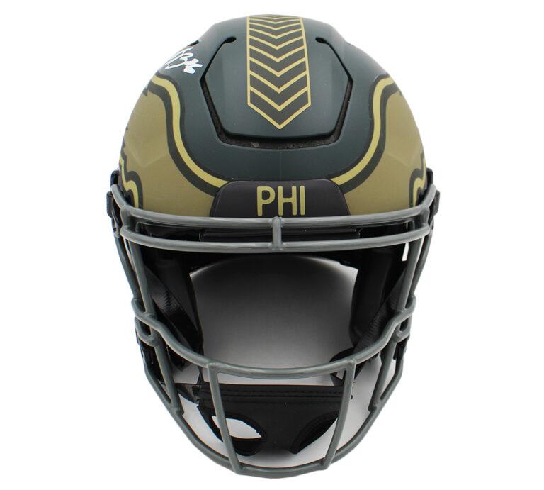 Riddell Philadelphia Eagles full-size authentic on-field salute to service alternate speedflex helmet has been hand-signed by Saquon Barkley.