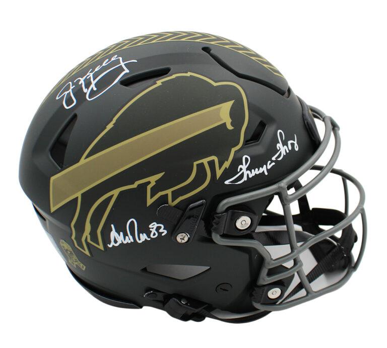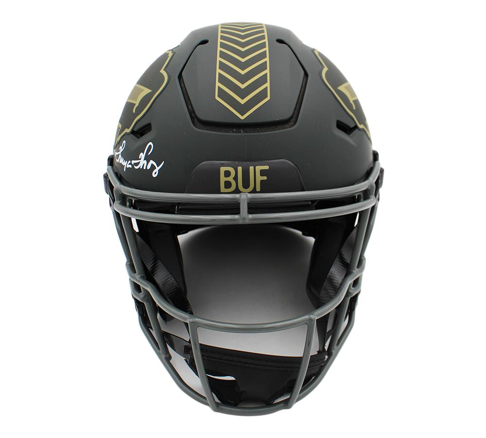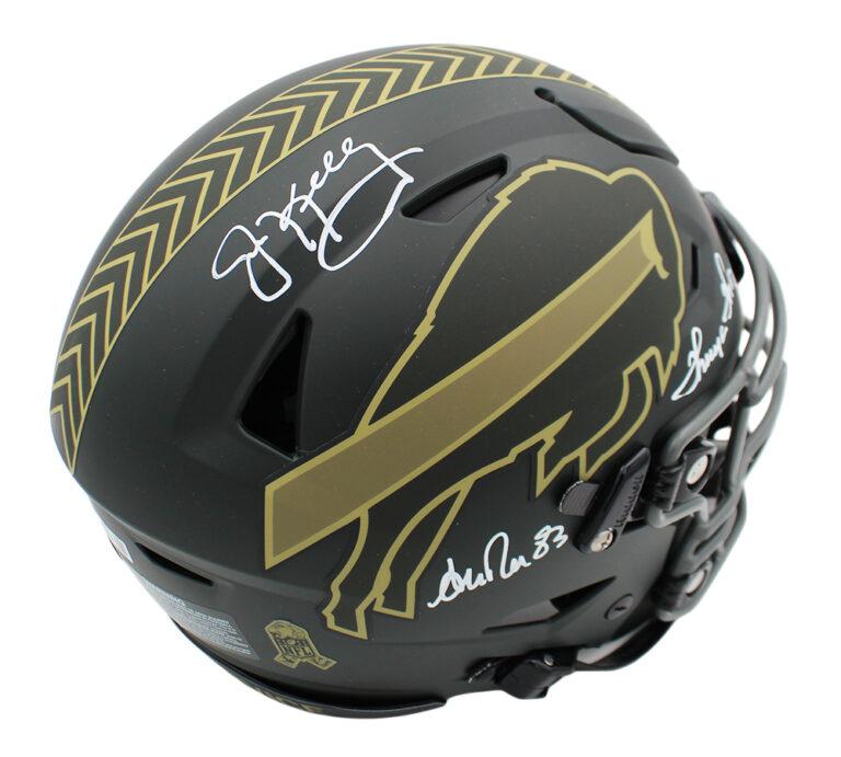 Riddell Buffalo Bills full-size authentic on-field salute to service alternate speed helmet has been hand-signed by Jim Kelly (HOF), Andre Reed (HOF), and Thurman Thomas (HOF)