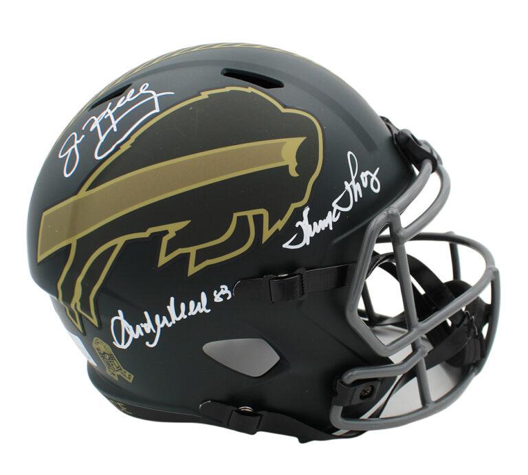 Riddell Buffalo Bills full-size salute to service alternate speed replica helmet has been hand-signed by Jim Kelly (HOF), Andre Reed (HOF), and Thurman Thomas (HOF)