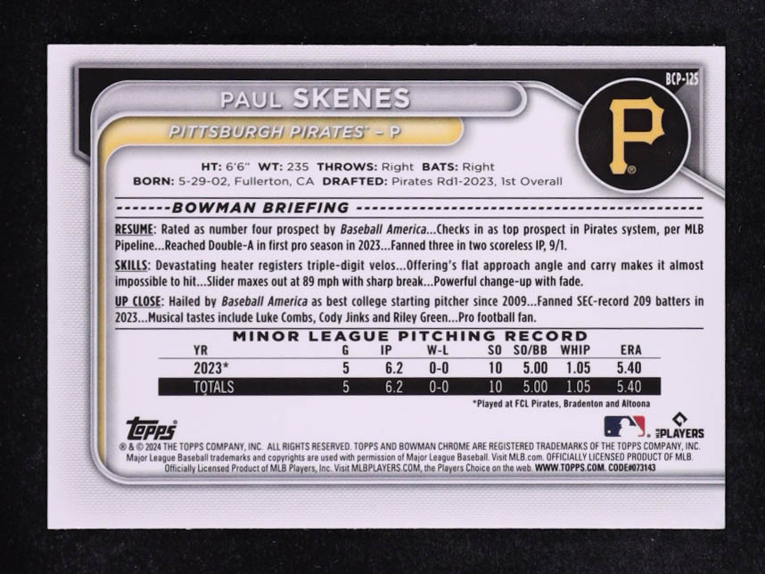 Paul Skenes 2024 Bowman Chrome Prospects Lunar Glow Refractors #BCP125 RC