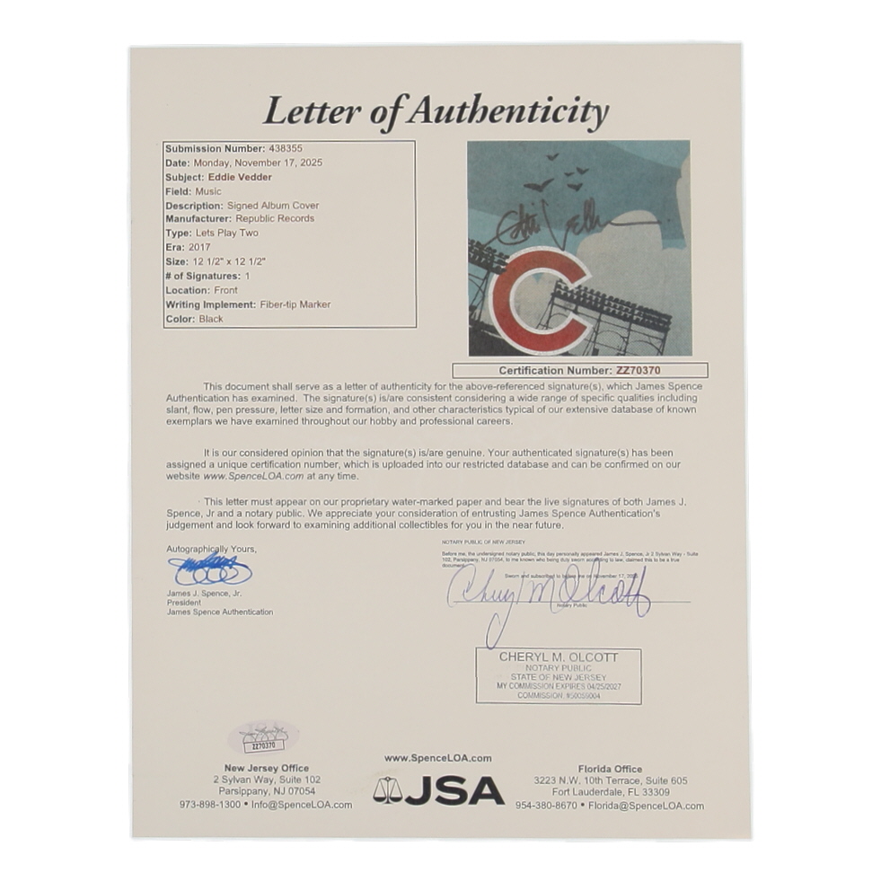 Album sleeve has been hand-signed by Eddie Vedder. Please note, vinyl record is included as shown.