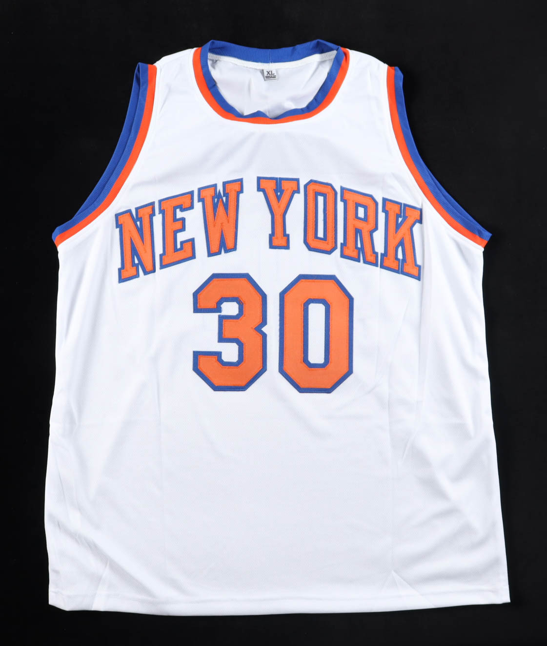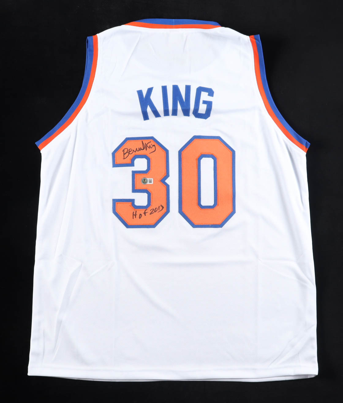 Custom jersey with everything sewn on, size XL. Hand-signed and inscribed by Bernard King (HOF).