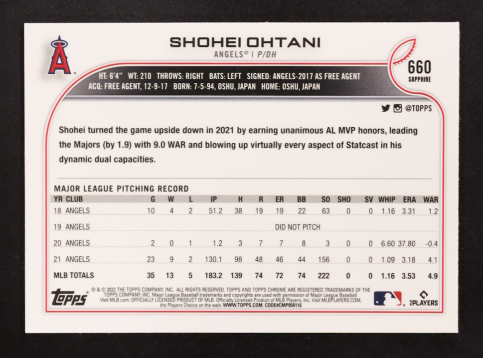 Shohei Ohtani 2022 Topps Chrome Sapphire #660