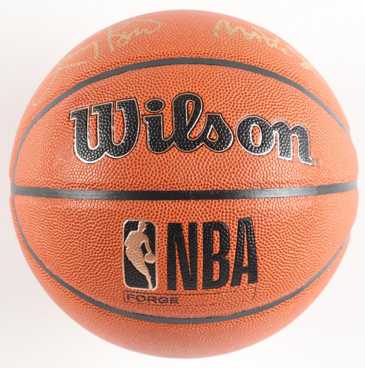 Wilson NBA Forge basketball With Display Stand has been hand-signed by Larry Bird (Boston Celtics, HOF) & Magic Johnson (Los Angeles Lakers, HOF).