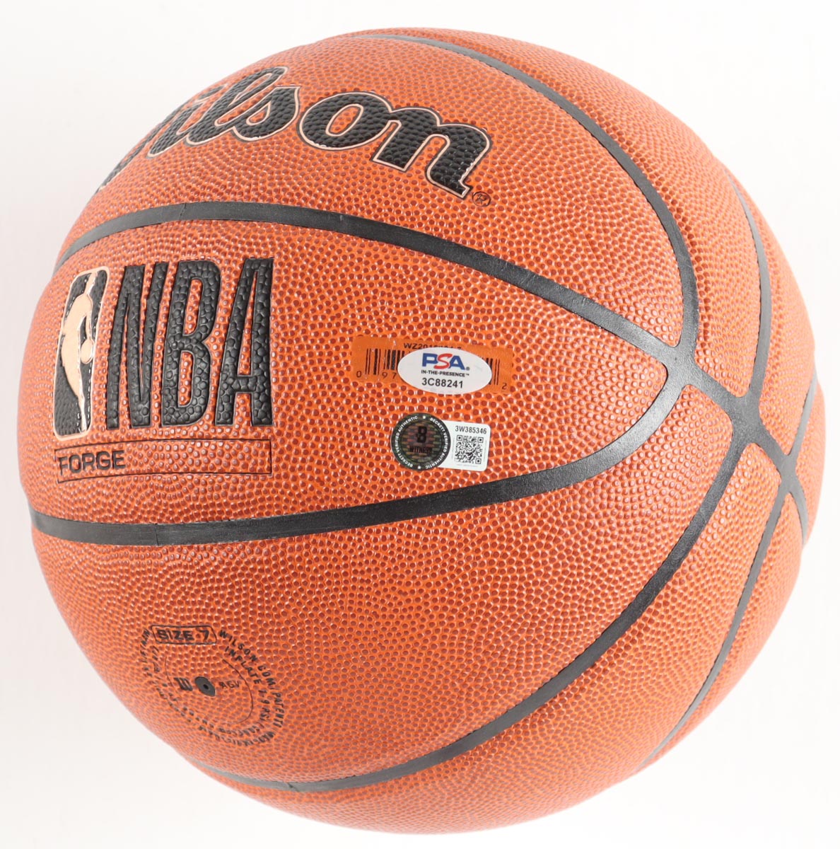 Larry Bird & Magic Johnson Signed NBA Basketball With Display Stand (PSA & Beckett)