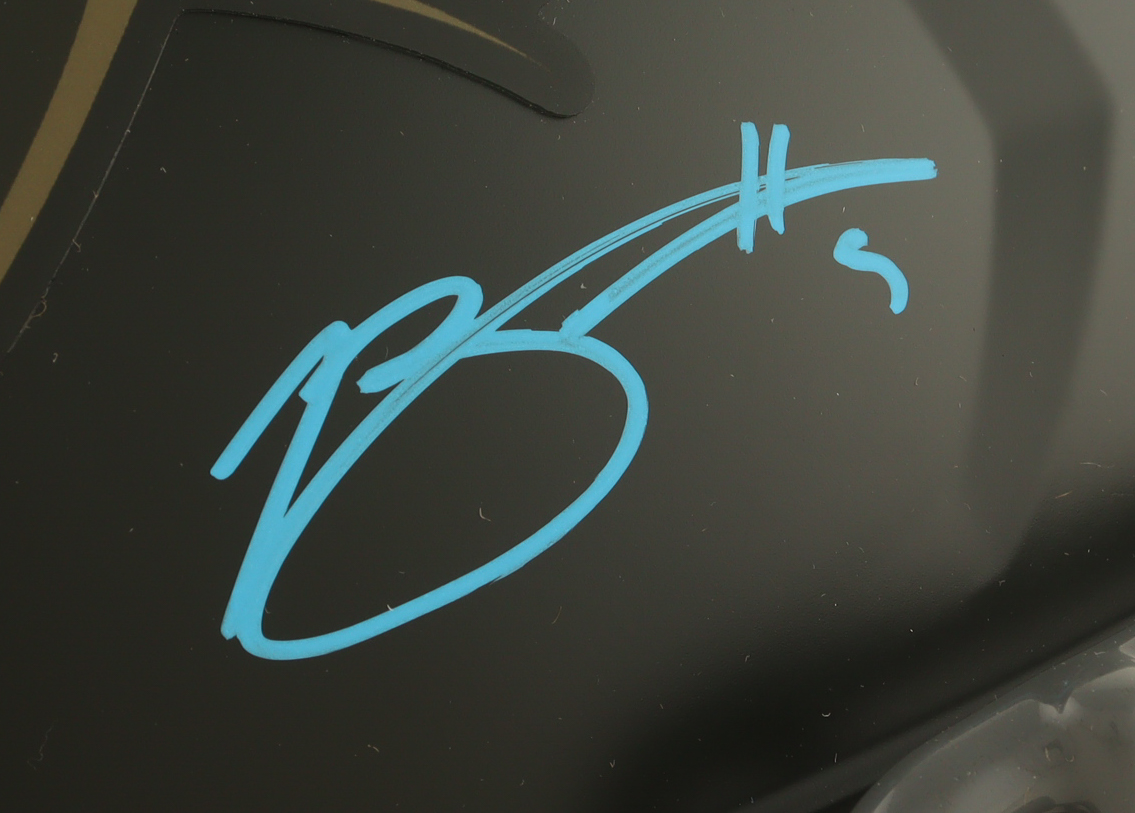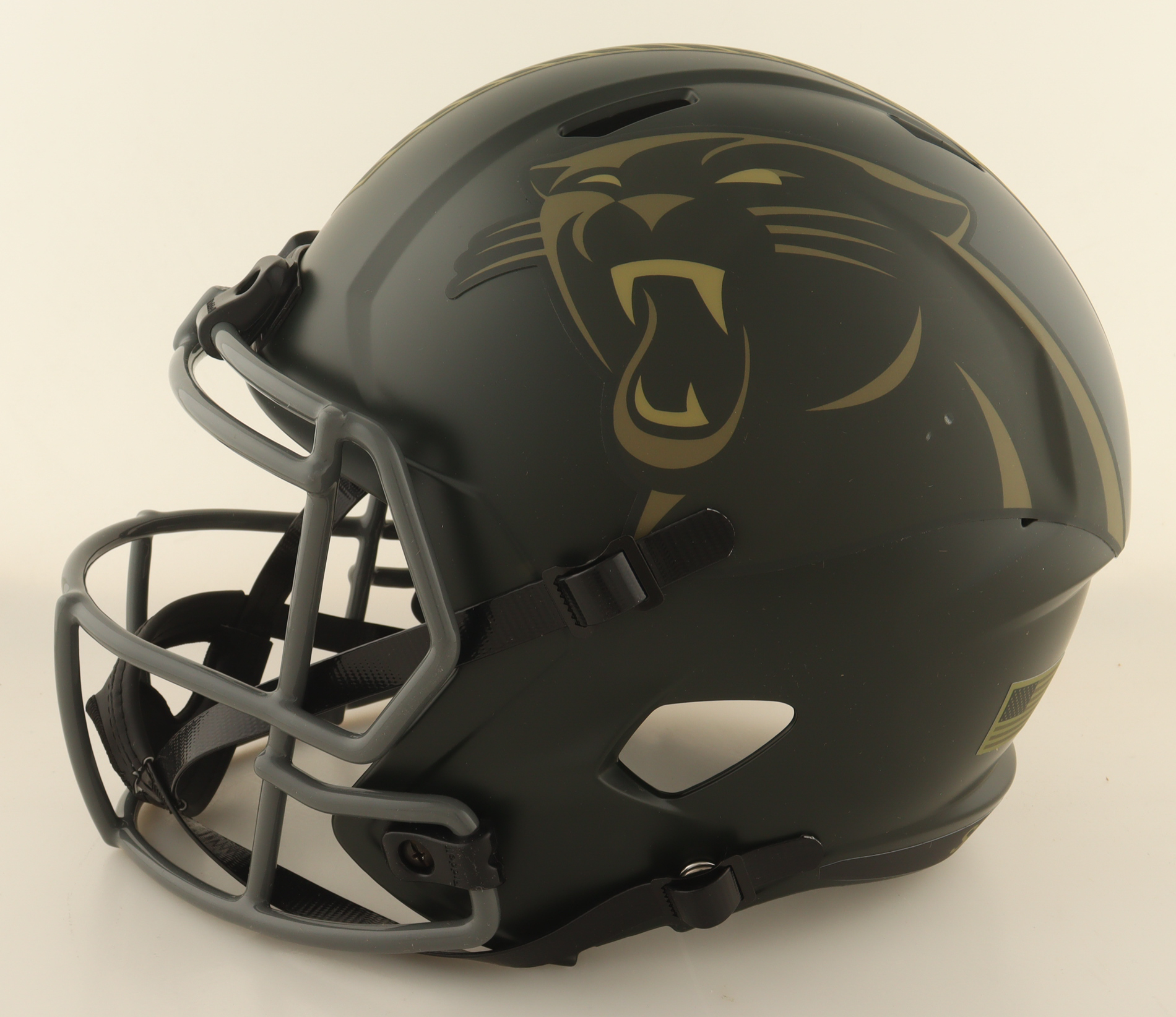 Riddell Carolina Panthers full-size replica salute to service alternate speed helmet has been hand-signed by Bryce Young.