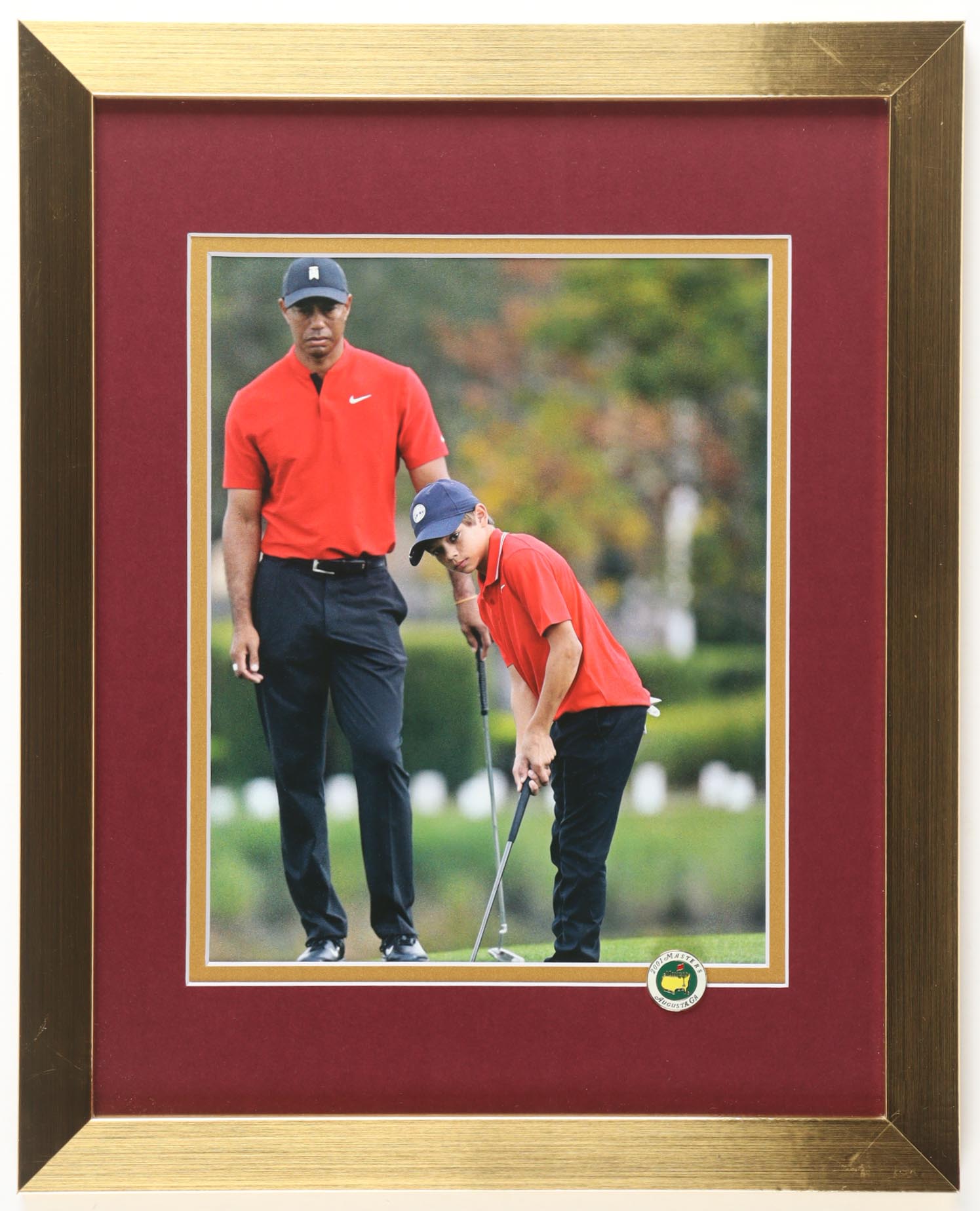 Custom frame measures approximately 13.25" x 16.25" in size and features a unsigned photo depicting Tiger Woods teaching his son Charlie at the Masters. Display includes an official 2001 Masters Champion Pin. Please note, the display is unsigned.