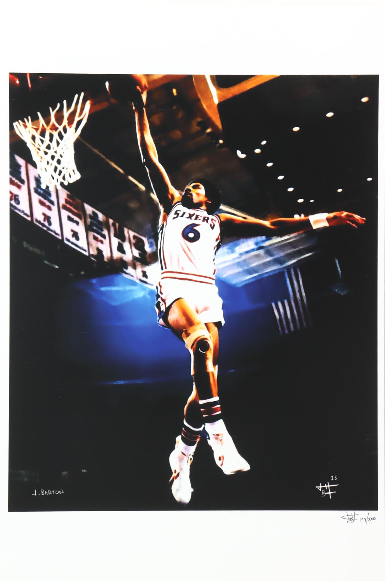 This limited edition giclee on high-quality matte fine art smooth 230gsm paper measures approximately 12" x 18" in size. The piece is hand-signed and numbered by the artist, Joshua Barton and features Julius Ervin (Philadelphia 76ers, HOF).