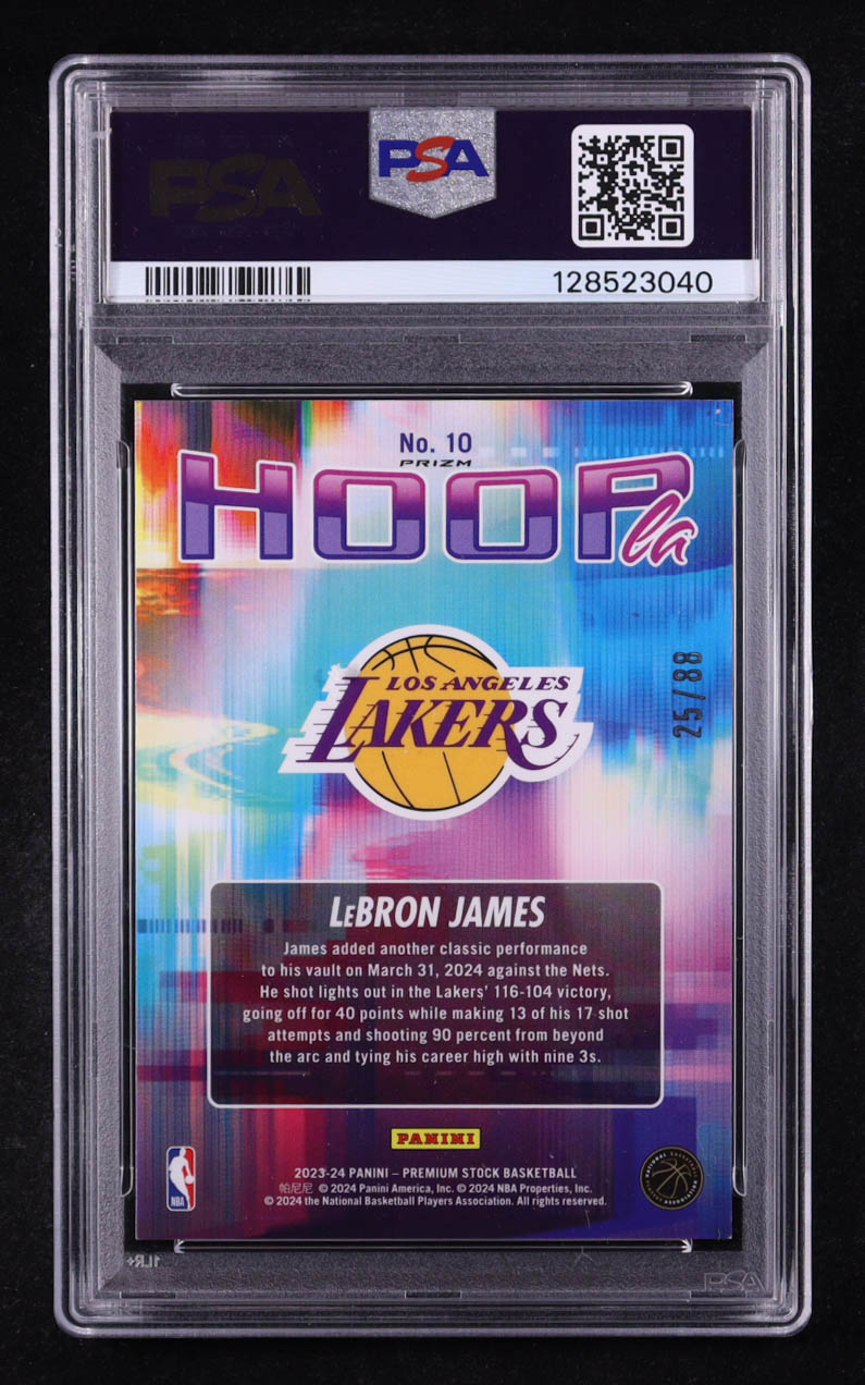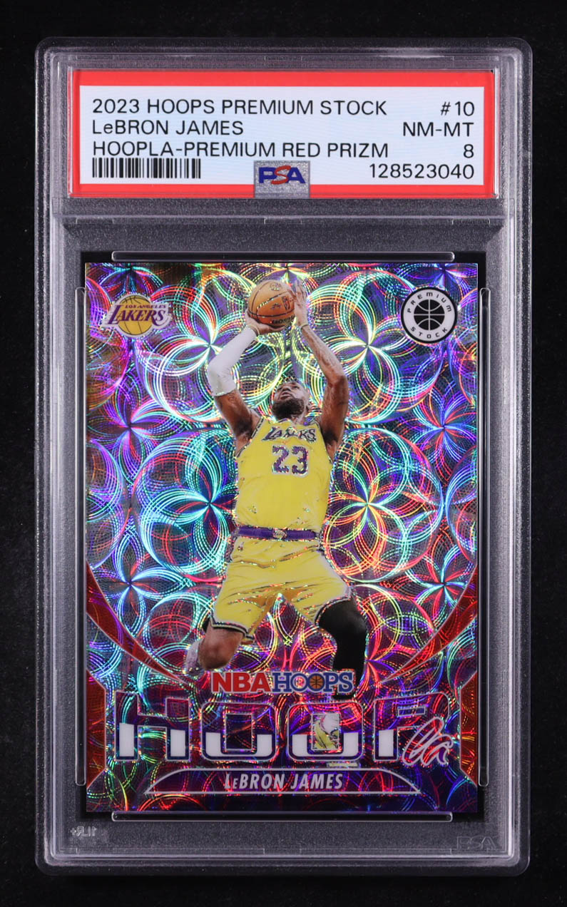 LeBron James 2023-24 Hoops Premium Stock Hoopla Premium Red Prizm #10 #25/88 (PSA 8)