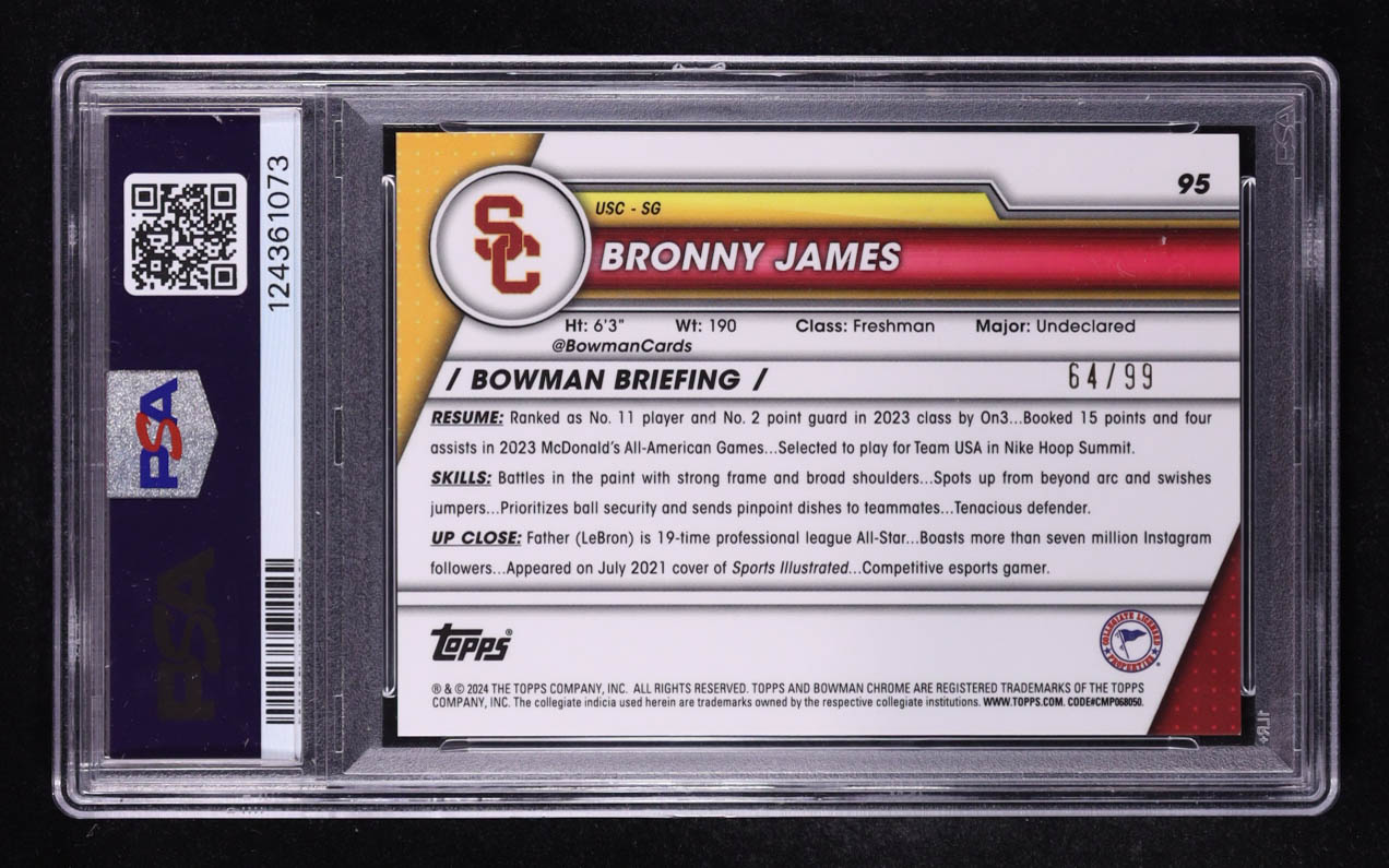 Bronny James Jr. 2023-24 Bowman Chrome University Sapphire Green Refractors #95 #64/99 RC (PSA 9)