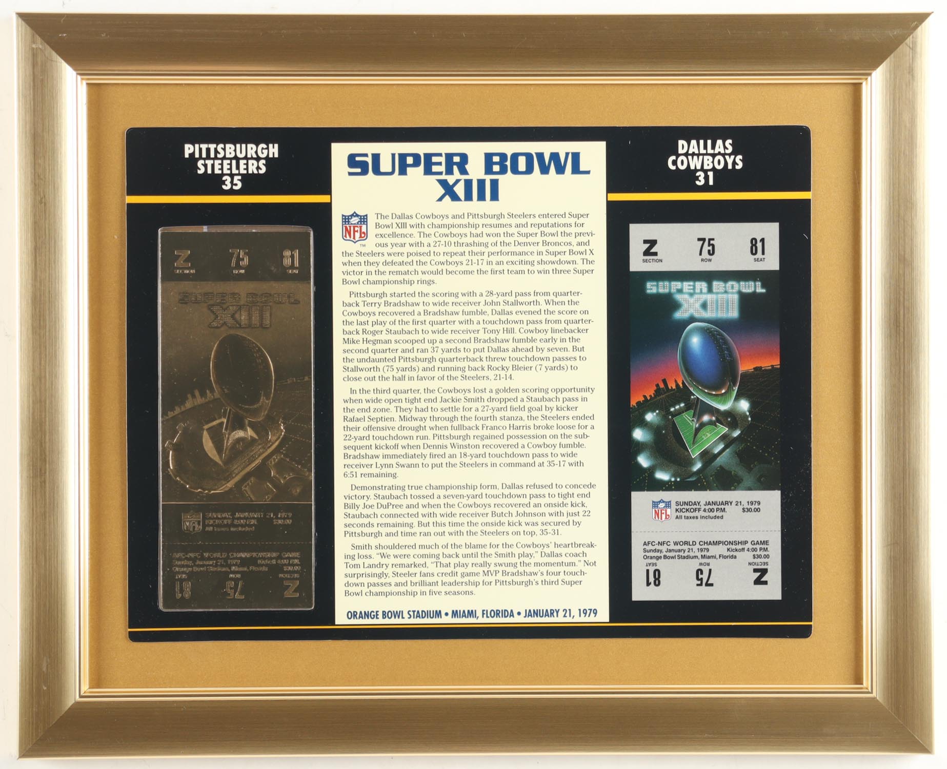 Super Bowl XIII Commemorative Score Card with 23KT Gold Ticket Framed Display