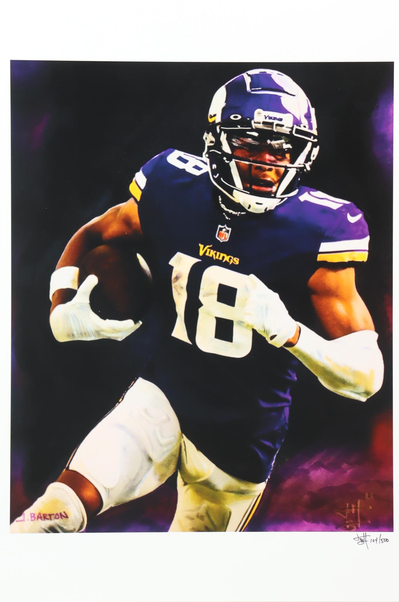 This limited edition giclee on high-quality matte fine art smooth 230gsm paper measures approximately 12" x 18" in size. The piece is hand-signed and numbered by the artist, Joshua Barton and features Justin Jefferson (Minnesota Vikings).