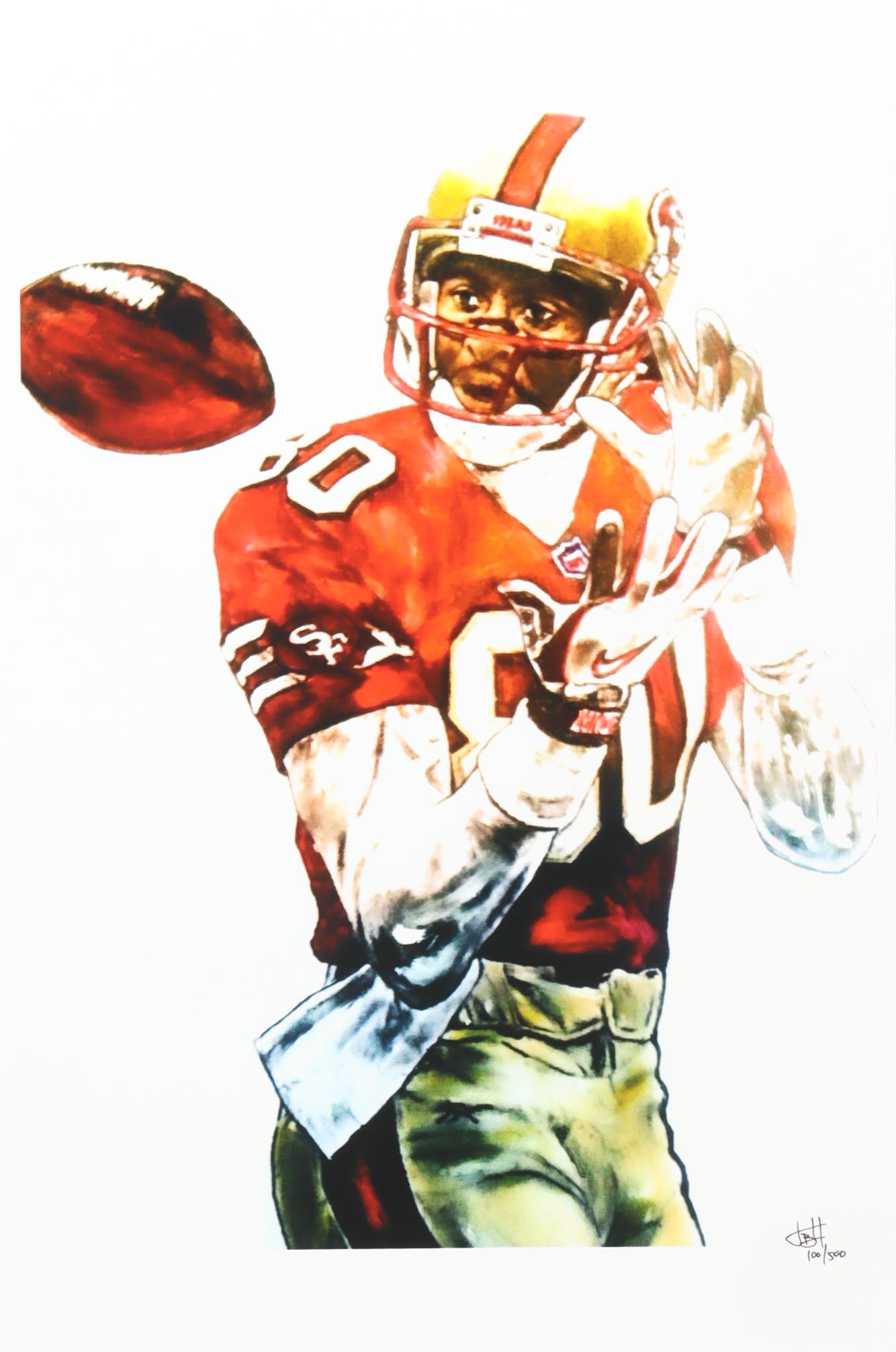 This limited edition giclee on high-quality matte fine art smooth 230gsm paper measures approximately 12" x 18" in size. The piece is hand-signed and numbered by the artist, Joshua Barton and features Jerry Rice (San Francisco 49ers, HOF).