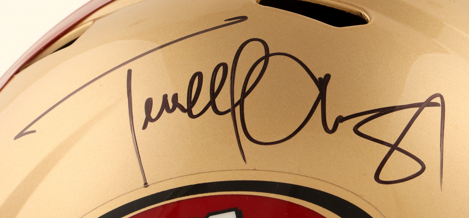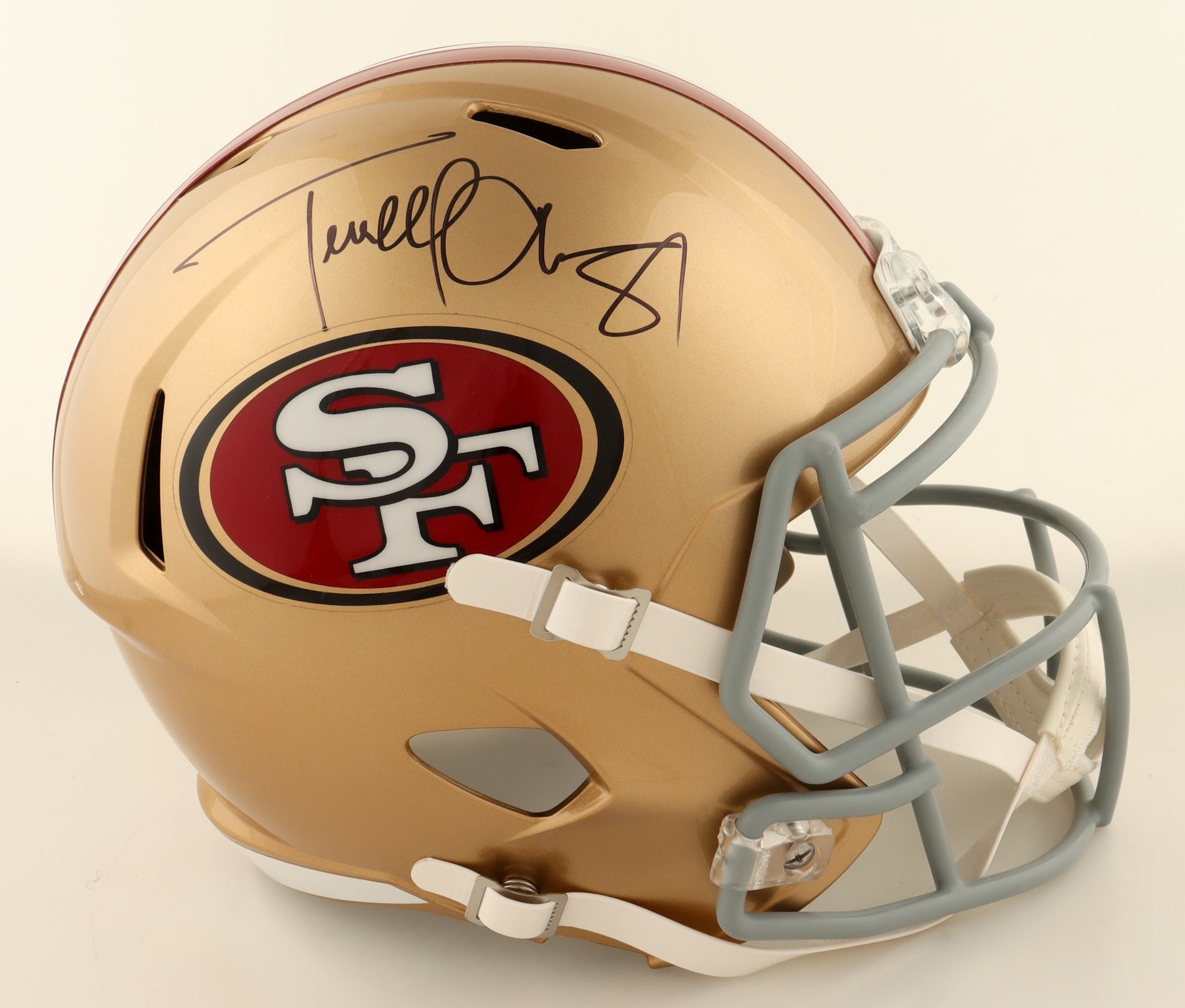 Riddell San Francisco 49ers full-size replica speed helmet. Has been hand-signed by Terrell Owens (HOF).