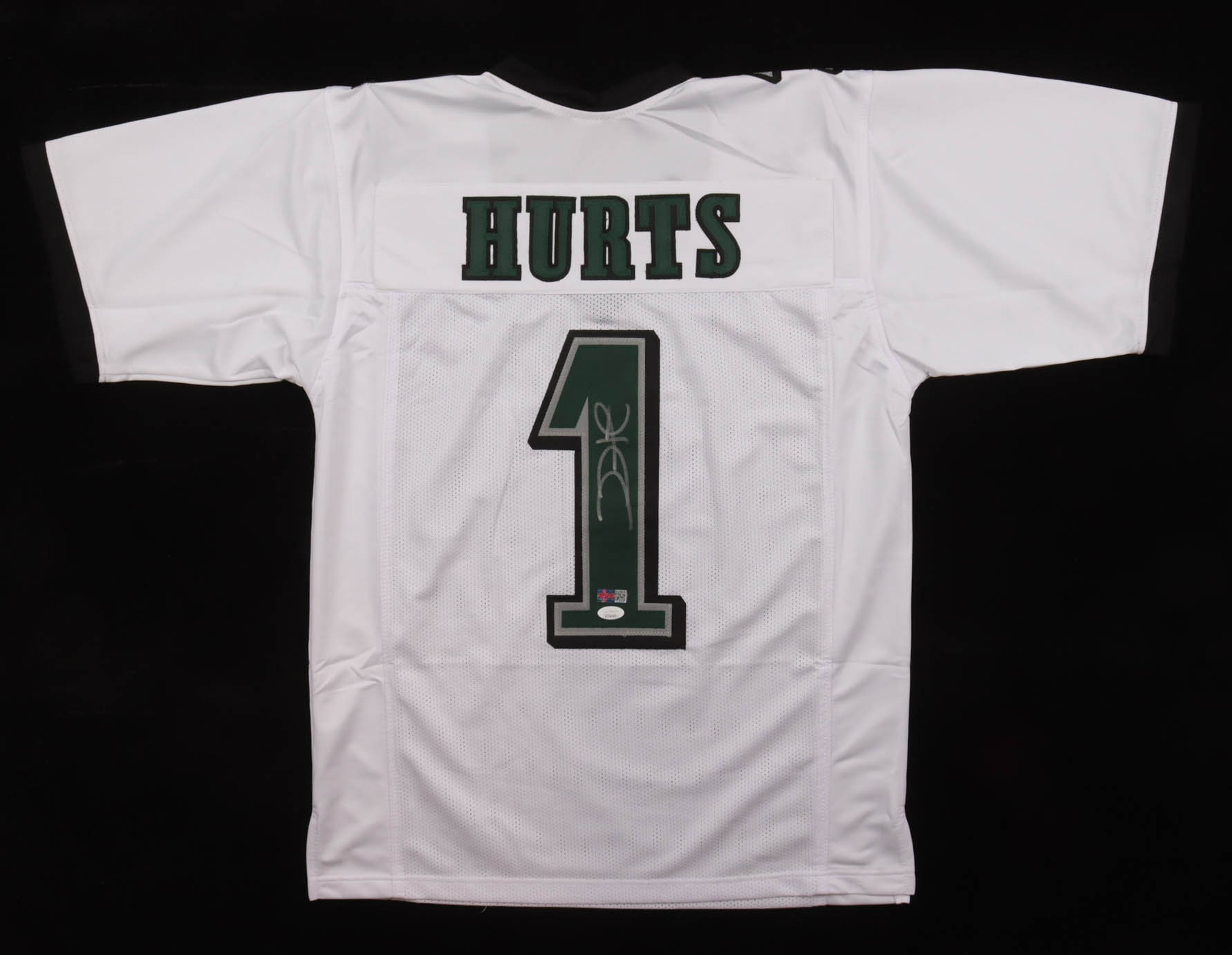 Custom jersey with everything sewn on, size XL. Hand-signed by Jalen Hurts.