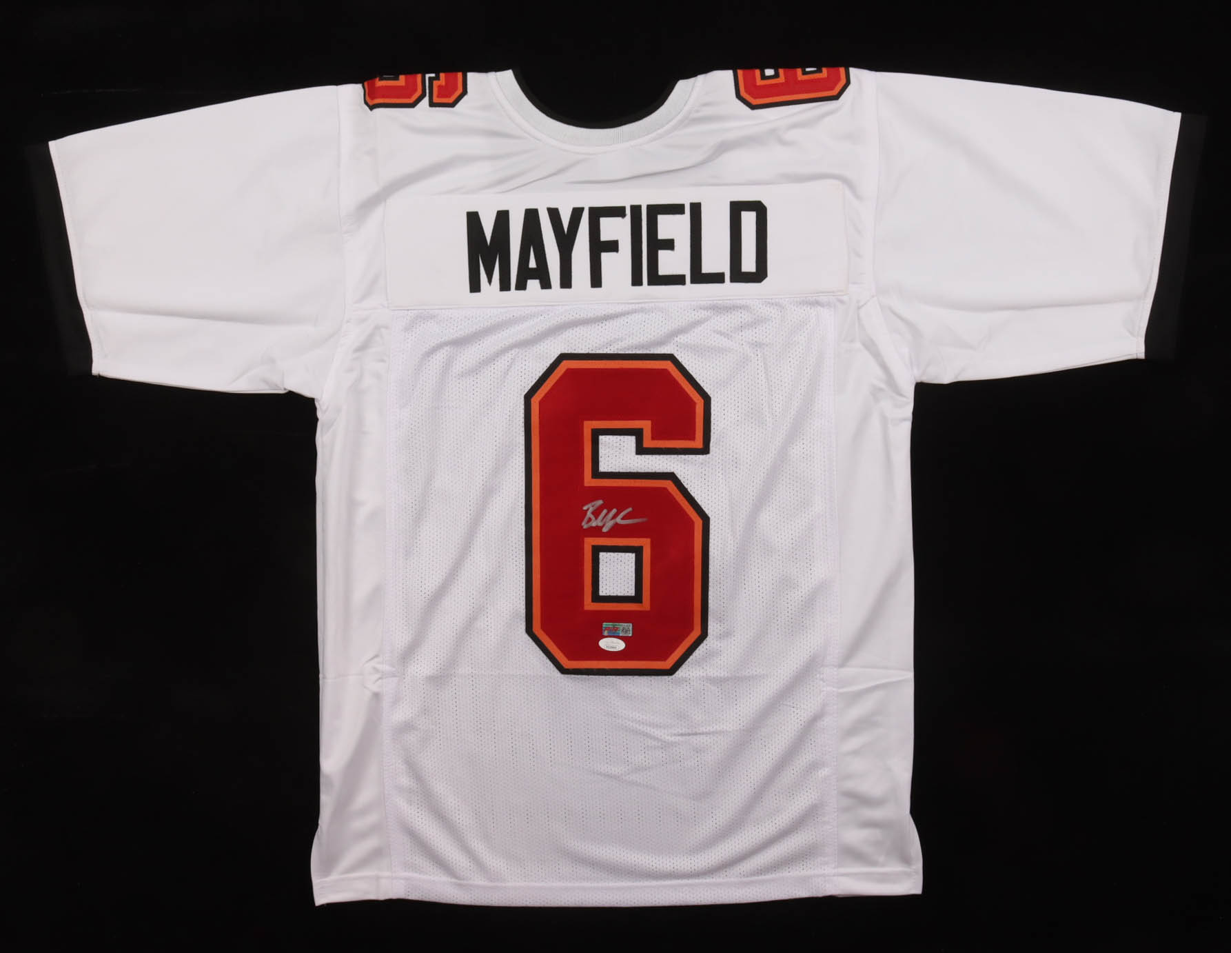 Custom jersey with everything sewn on, size XL. Hand-signed by Baker Mayfield.