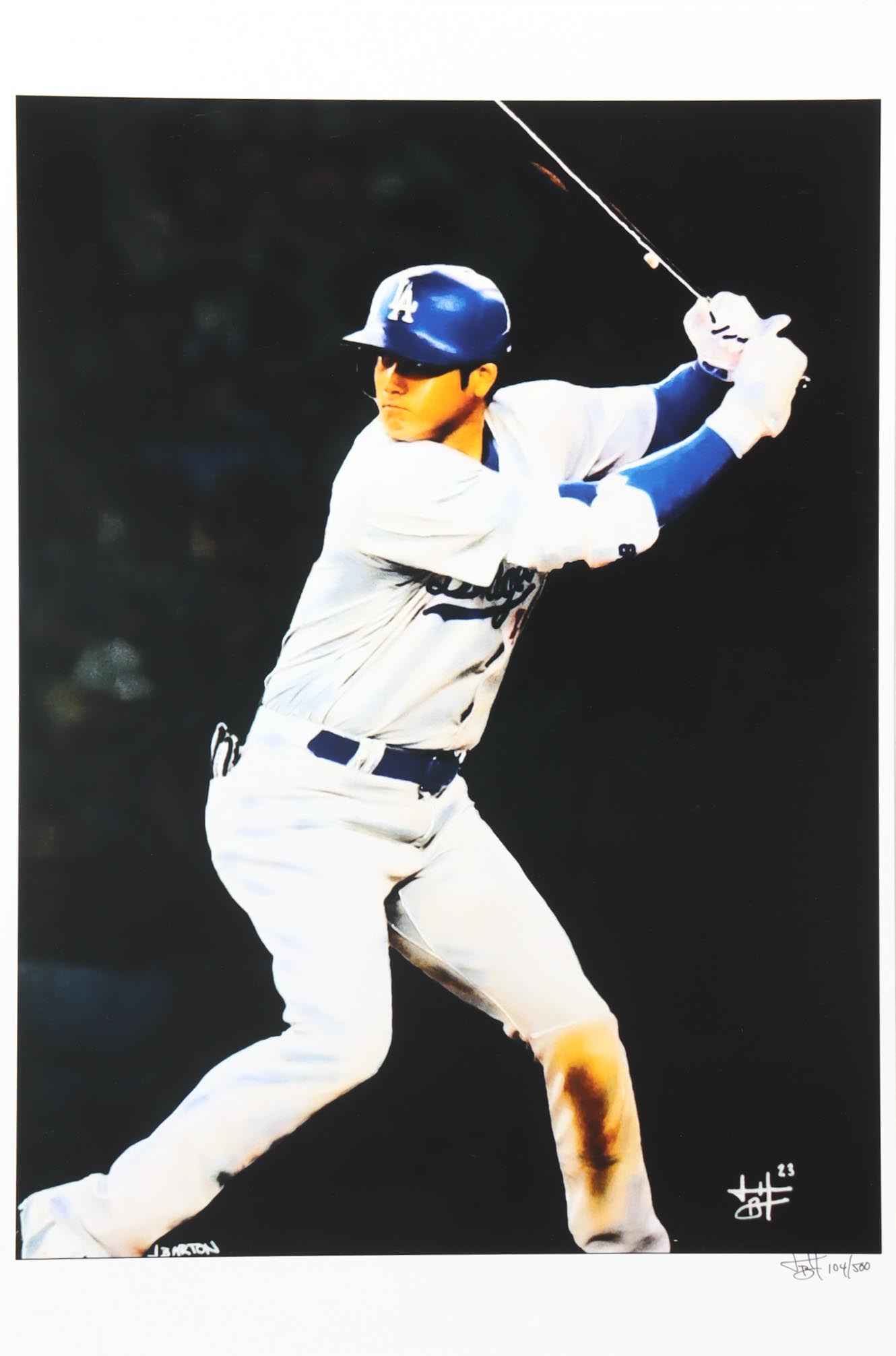 This limited edition giclee on high-quality matte fine art smooth 230gsm paper measures approximately 12" x 18" in size. The piece is hand-signed and numbered by the artist, Joshua Barton and features Shohei Ohtani (Los Angeles Dodgers).
