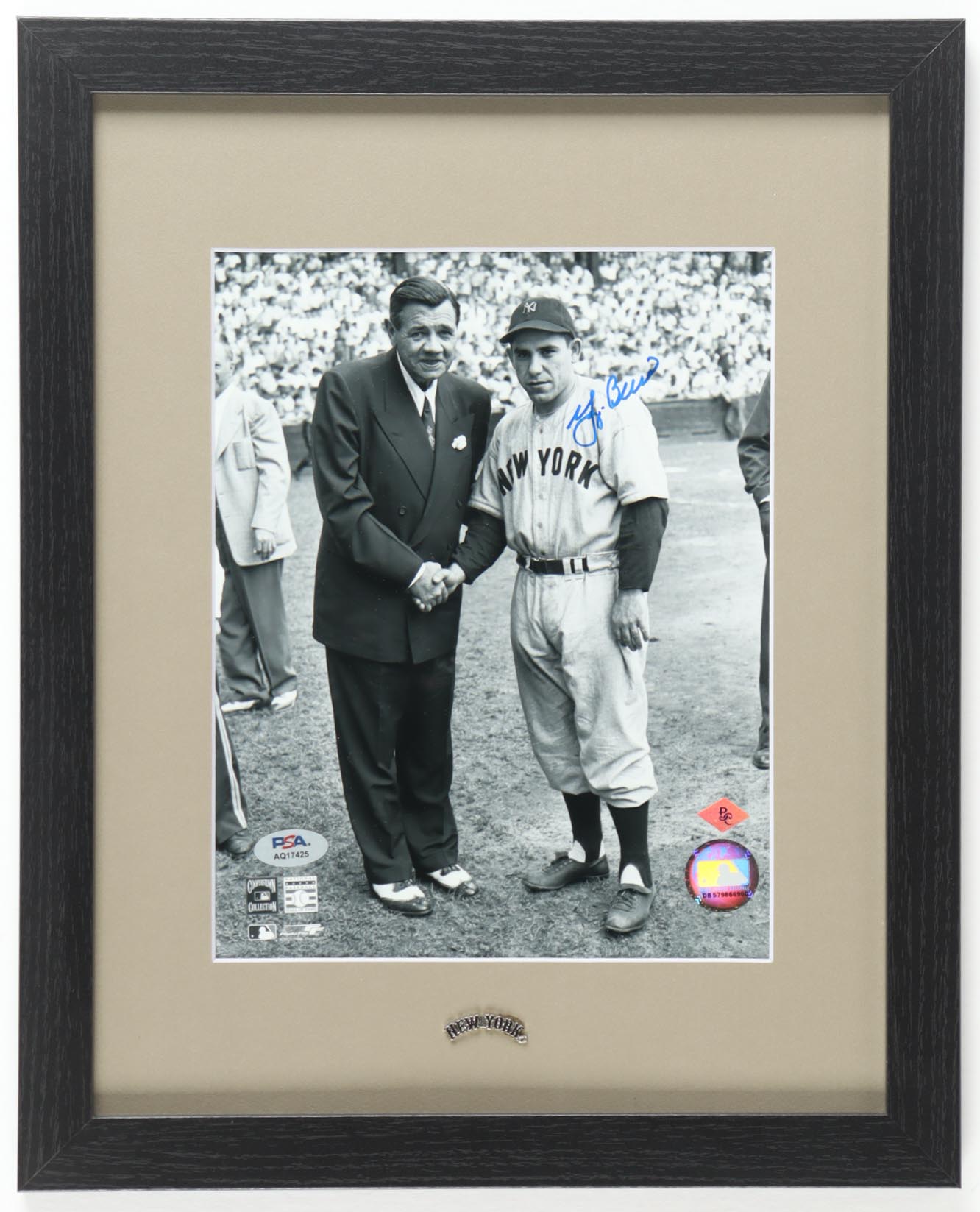 Custom frame measures approximately 13" x 16" in size and features a photo that has been hand-signed by Yogi Berra (D. 2015, New York Yankees, HOF). Display also includes a vintage New York Yankees logo pin.