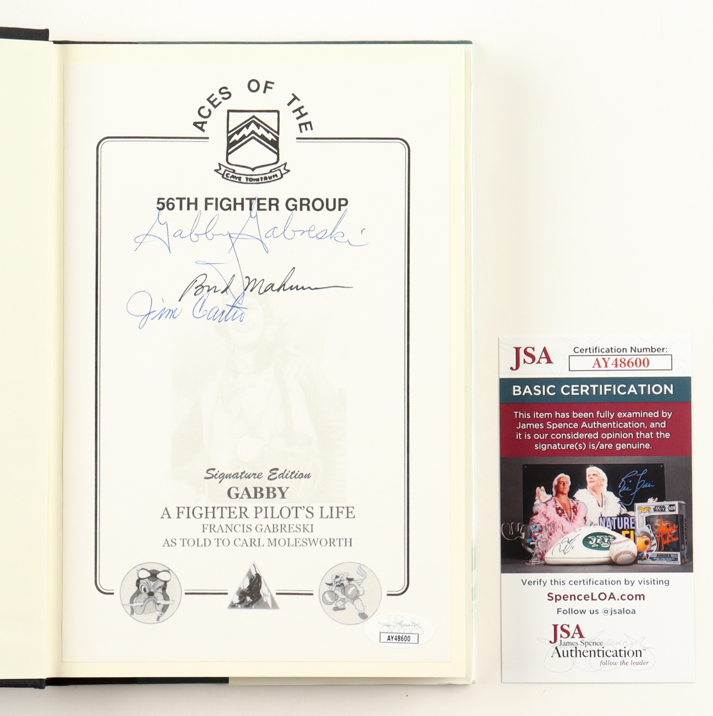 "Gabby" Hardcover Book has been hand-signed on the inside cover page by Gabby Gabreski, Walker "Bud" Mahurin, and James Carter. Please note, there is scuffing on the cover.