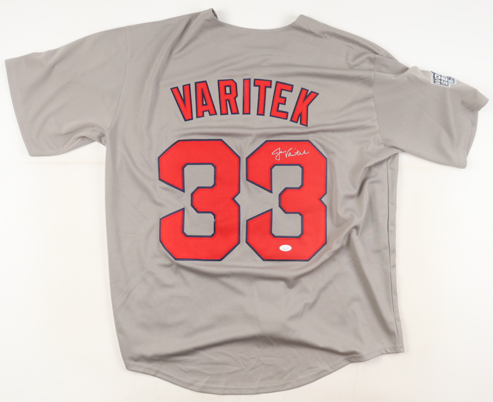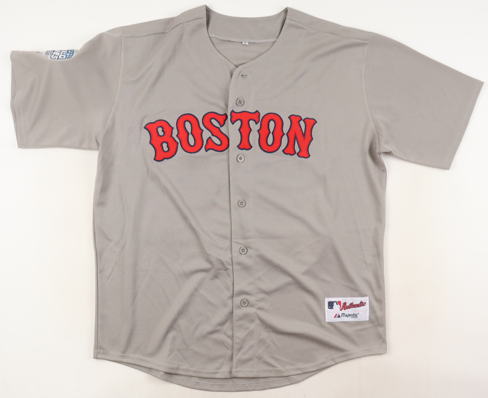 Majestic jersey with everything sewn on, size XL. Hand-signed by Jason Varitek (Boston Red Sox). The jersey includes an 2004 World Series patch on the right sleeve.