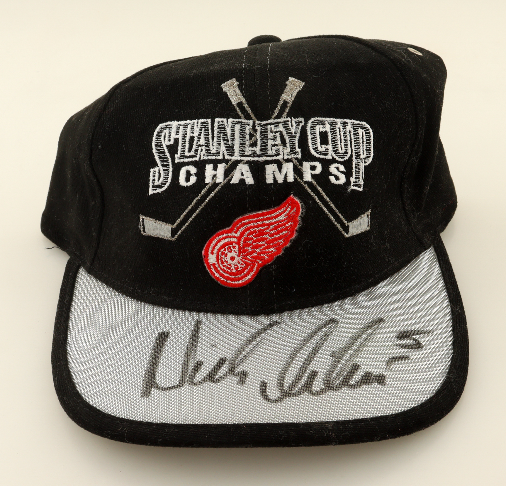 Starter Detroit Red Wings 1997 Stanley Cup Champs Logo adjustable hat has been hand-signed by Nicklas Lidstrom (HOF).