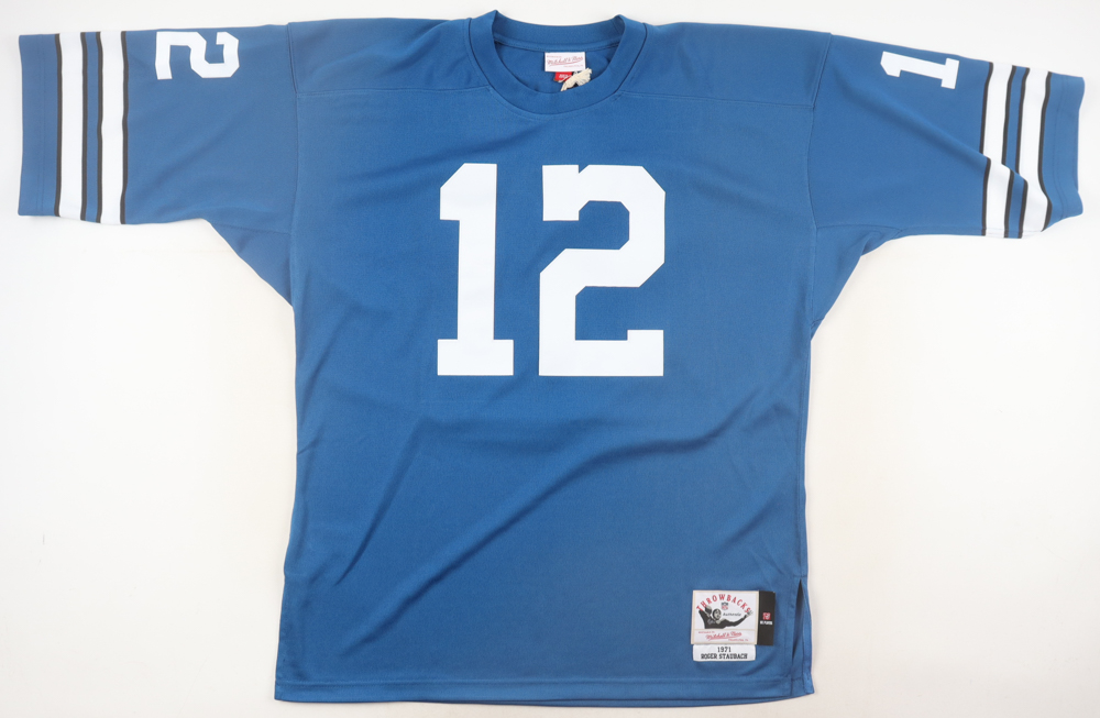 Mitchell & Ness jersey with everything sewn on, size 48 (XL). Hand-signed and inscribed by Roger Staubach (Dallas Cowboys, HOF).