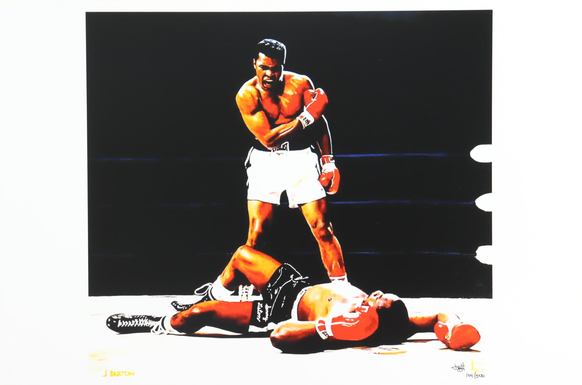 This limited edition giclee on high-quality matte fine art smooth 230gsm paper measures approximately 12" x 18" in size. The piece is hand-signed and numbered by the artist, Joshua Barton and features Muhammad Ali (D. 2016, HOF).
