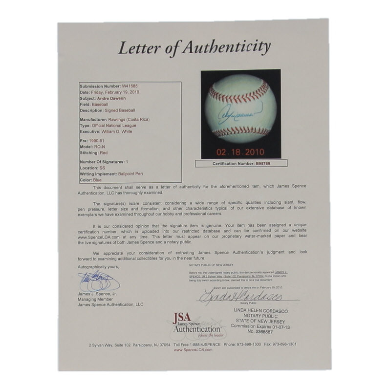 Rawlings Official National League Baseball. Hand-signed by Andre Dawson (Chicago Cubs, HOF). Please note, the baseball is naturally toned and stained.