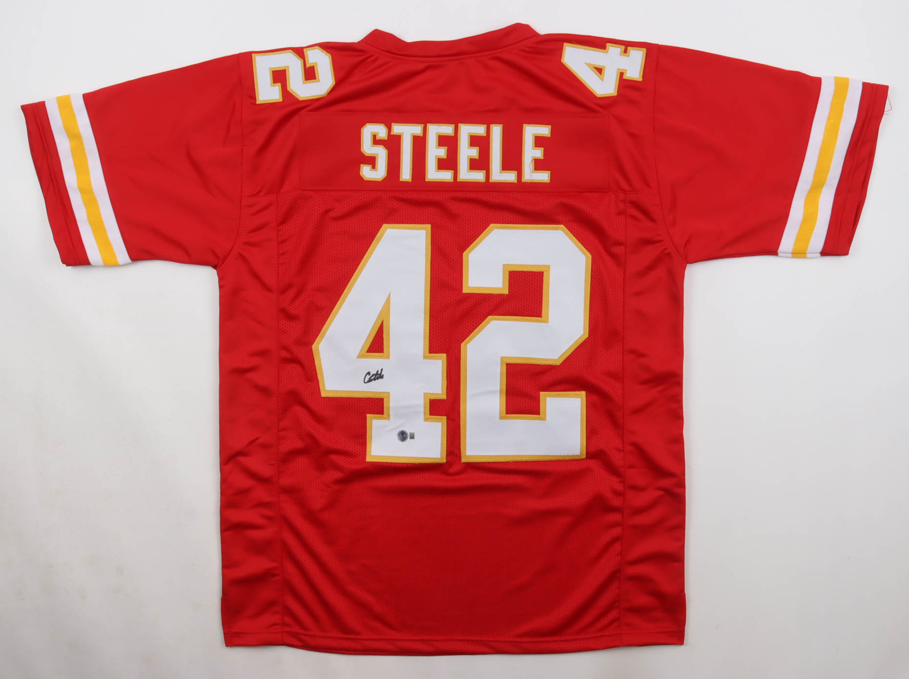Custom jersey with everything sewn on, size XL. Hand-signed by Carson Steele. Please note, the signature has bled.