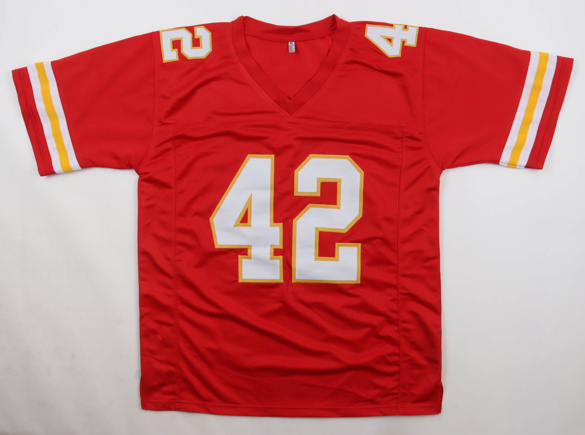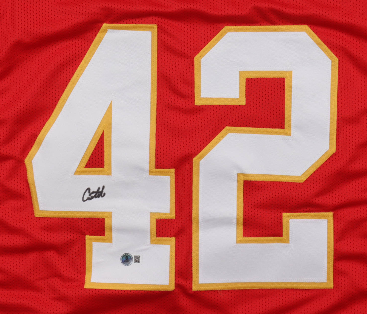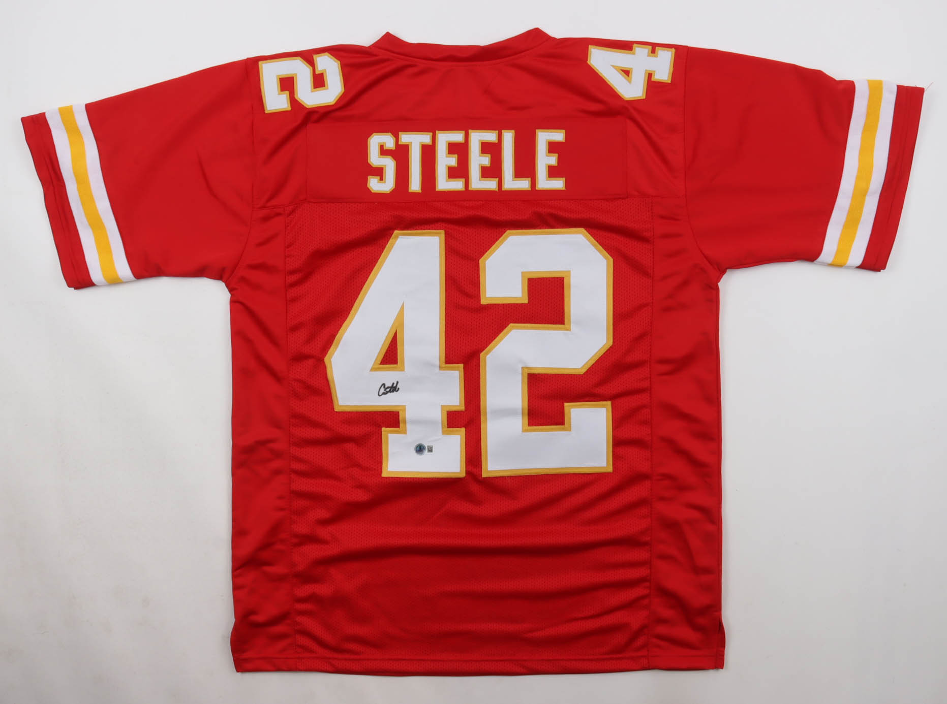 Custom jersey with everything sewn on, size XL. Hand-signed by Carson Steele. Please note, the signature has bled.
