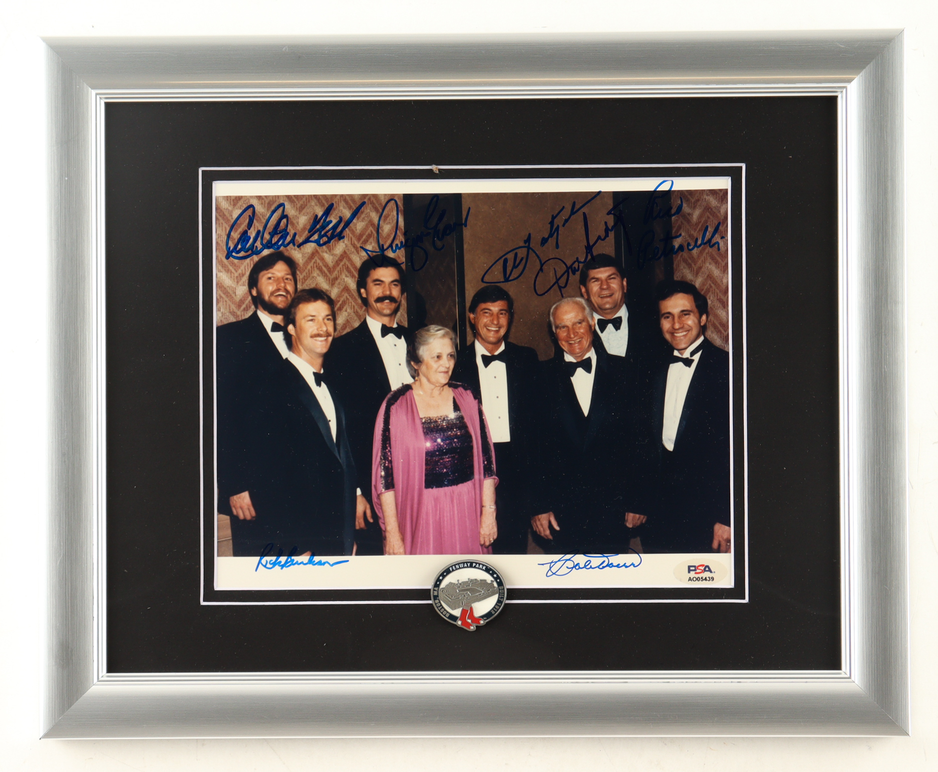 Custom framed photo display measures 13" x 16" in size. Features a photo that has been hand-signed by (7) Carl Yastrzemskin, Carlton Fisk, Dwight Evans, Bobby Doerr, Rico Petrocelli, Rick Burleson, and Dick Radatz. Display also includes an official Boston Red Sox Fenway Park pin. Please refer to photo regarding the condition of the item.