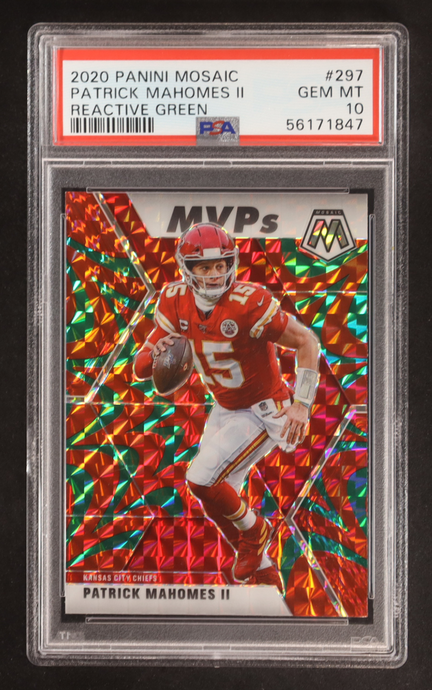 Patrick Mahomes II 2020 Panini Mosaic Mosaic Reactive Green #297 MVP (PSA 10)