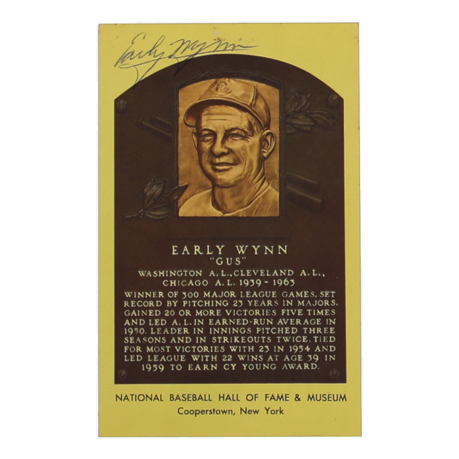 Early Wynn Signed Hall of Fame Plaque Postcard (JSA)