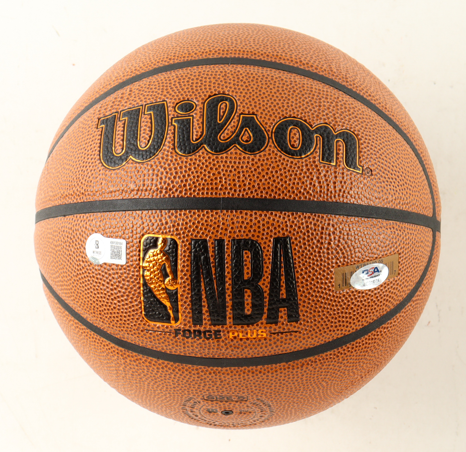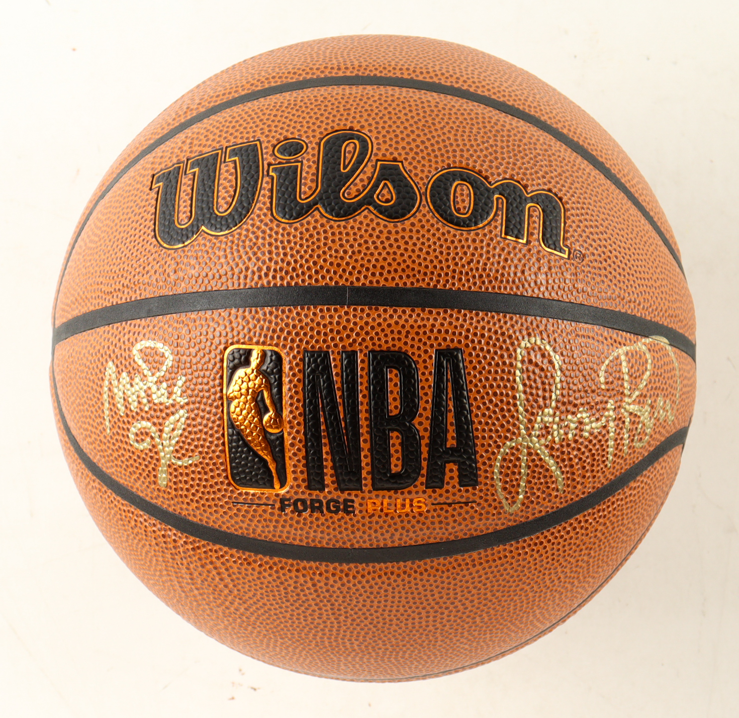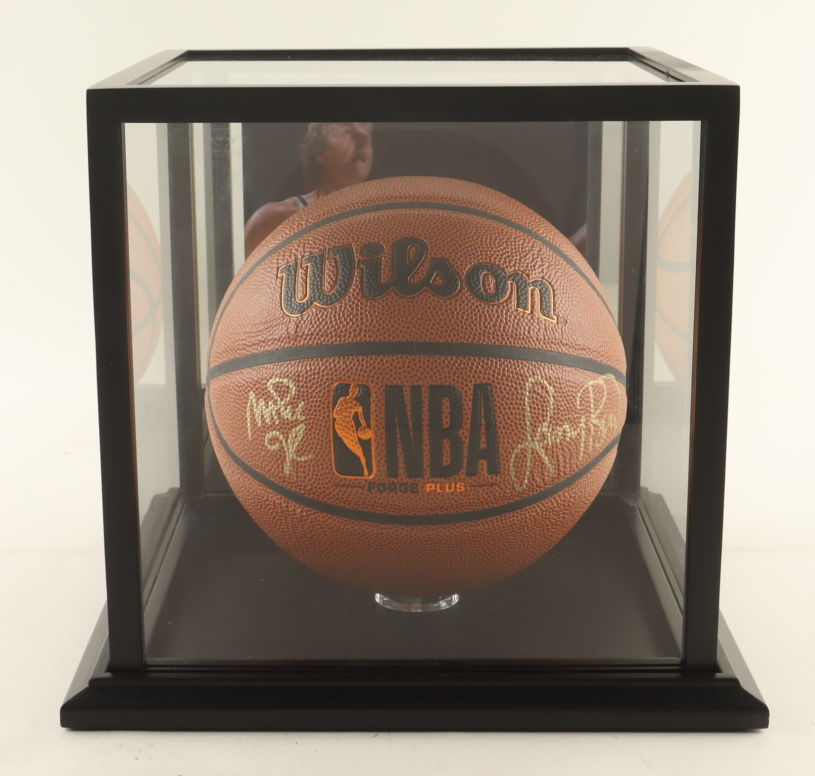 NBA Forge Logo Basketball. Hand-signed by Magic Johnson (Los Angeles Lakers, HOF) and Larry Bird (Boston Celtics, HOF). The display case is included as shown.
